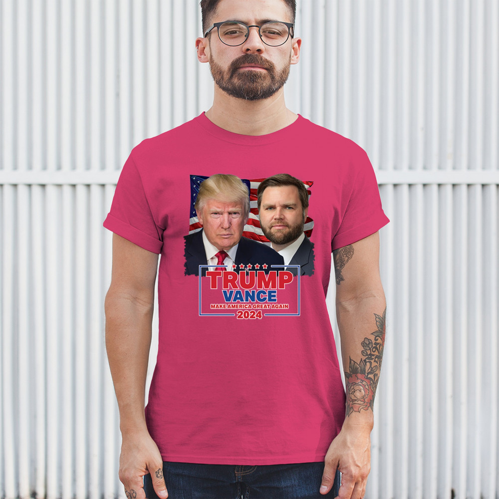 Show your support for Trump-Vance 2024 with this bold design featuring Trump and Vance against the American flag. Perfect for rallies and political events.