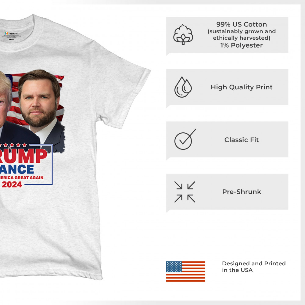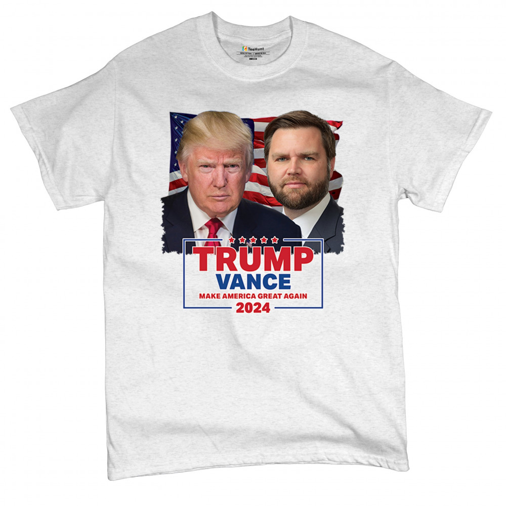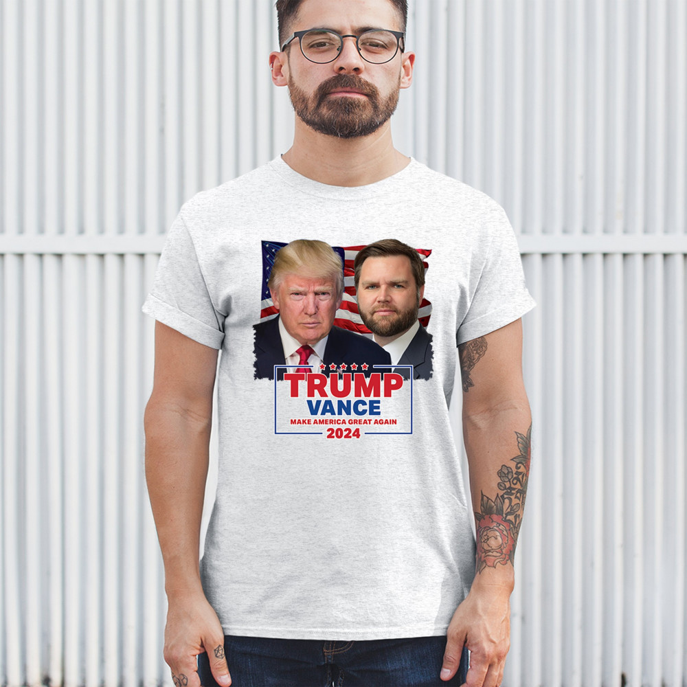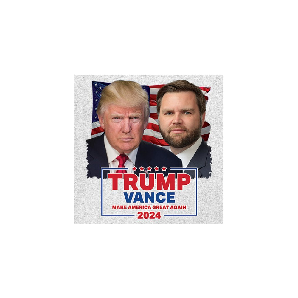 Show your support for Trump-Vance 2024 with this bold design featuring Trump and Vance against the American flag. Perfect for rallies and political events.