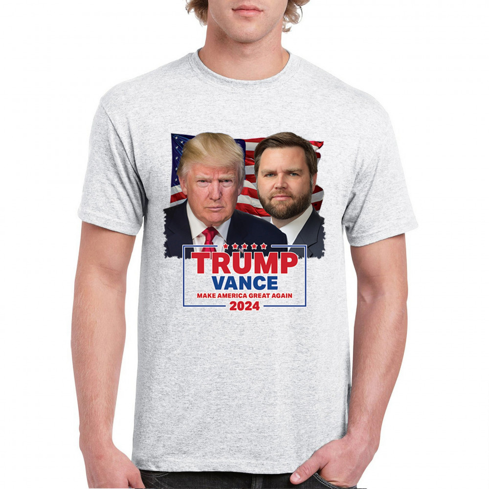 Support the Trump-Vance 2024 campaign with our exclusive design, featuring prominent images of Donald Trump and J.D. Vance set against the American flag. This design is perfect for rallies, political events, and daily wear, showcasing your dedication to the conservative movement. Its bold graphics and patriotic theme make it a standout piece for any supporter. Join the movement and proudly display your support with this dynamic and inspiring design.