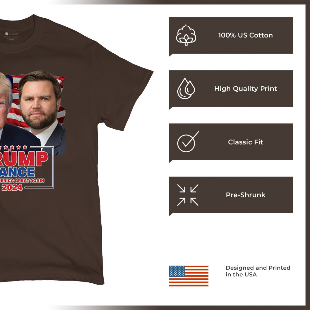 Support the Trump-Vance 2024 campaign with our exclusive design, featuring prominent images of Donald Trump and J.D. Vance set against the American flag. This design is perfect for rallies, political events, and daily wear, showcasing your dedication to the conservative movement. Its bold graphics and patriotic theme make it a standout piece for any supporter. Join the movement and proudly display your support with this dynamic and inspiring design.