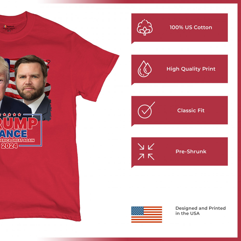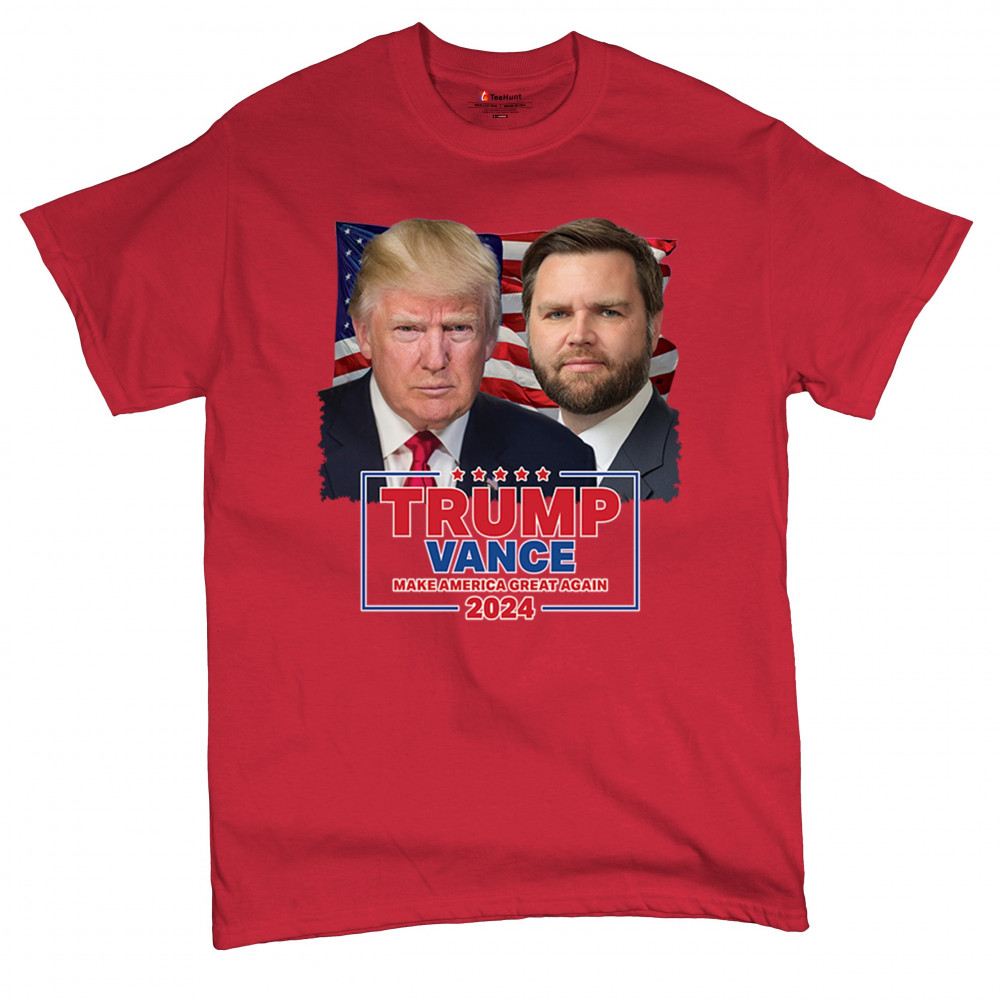 Show your support for Trump-Vance 2024 with this bold design featuring Trump and Vance against the American flag. Perfect for rallies and political events.