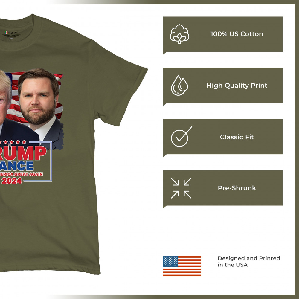 Support the Trump-Vance 2024 campaign with our exclusive design, featuring prominent images of Donald Trump and J.D. Vance set against the American flag. This design is perfect for rallies, political events, and daily wear, showcasing your dedication to the conservative movement. Its bold graphics and patriotic theme make it a standout piece for any supporter. Join the movement and proudly display your support with this dynamic and inspiring design.