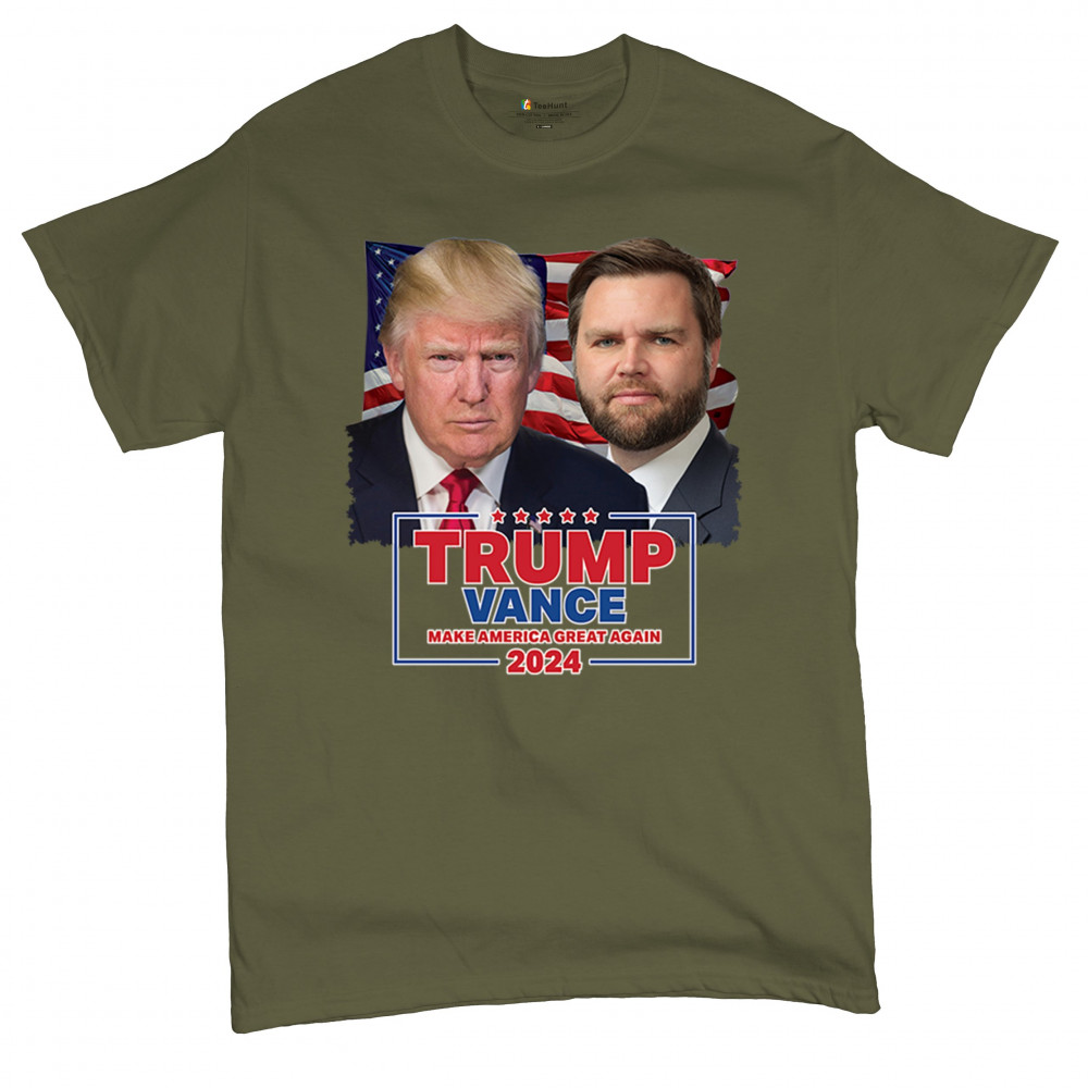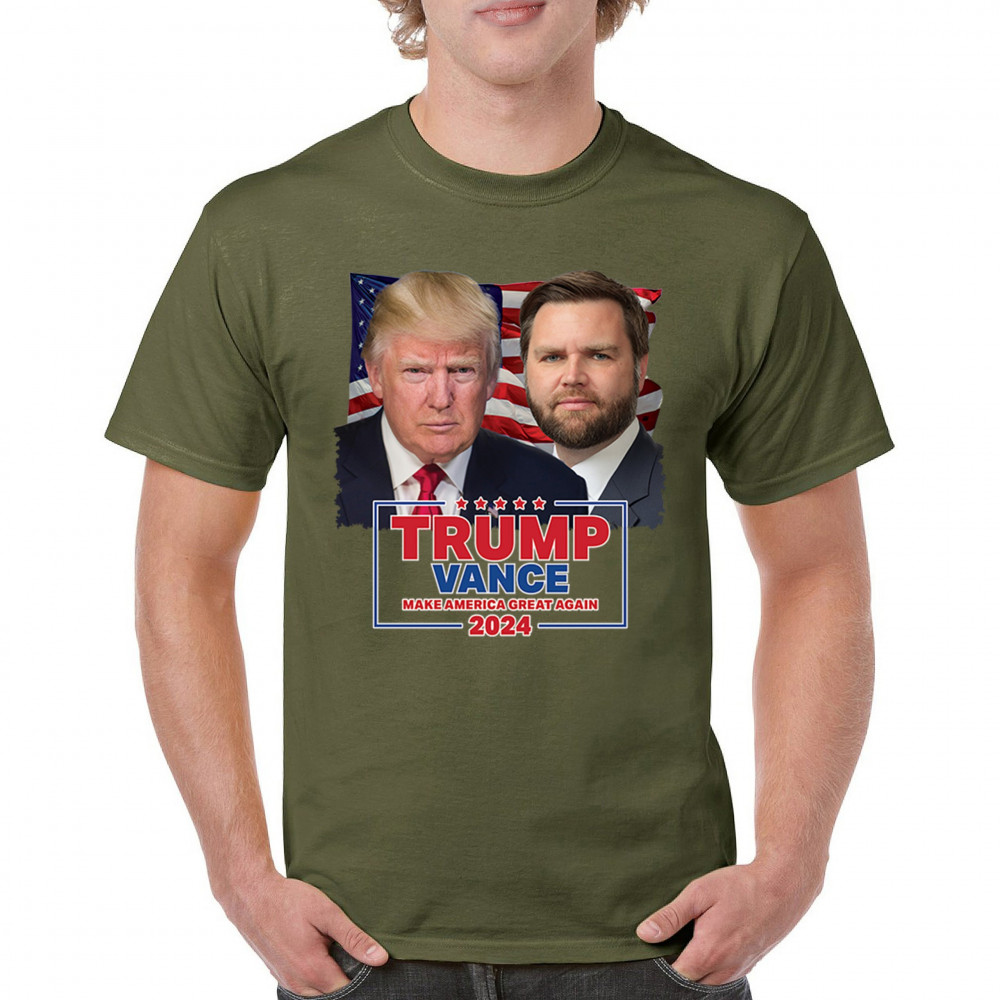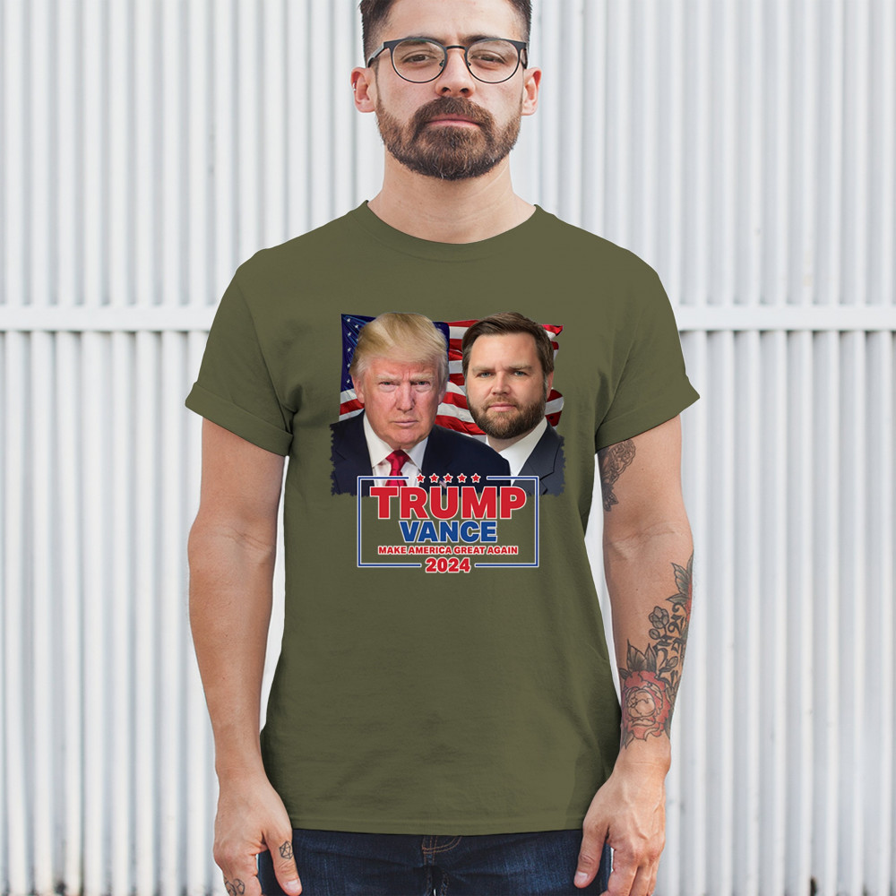 Show your support for Trump-Vance 2024 with this bold design featuring Trump and Vance against the American flag. Perfect for rallies and political events.