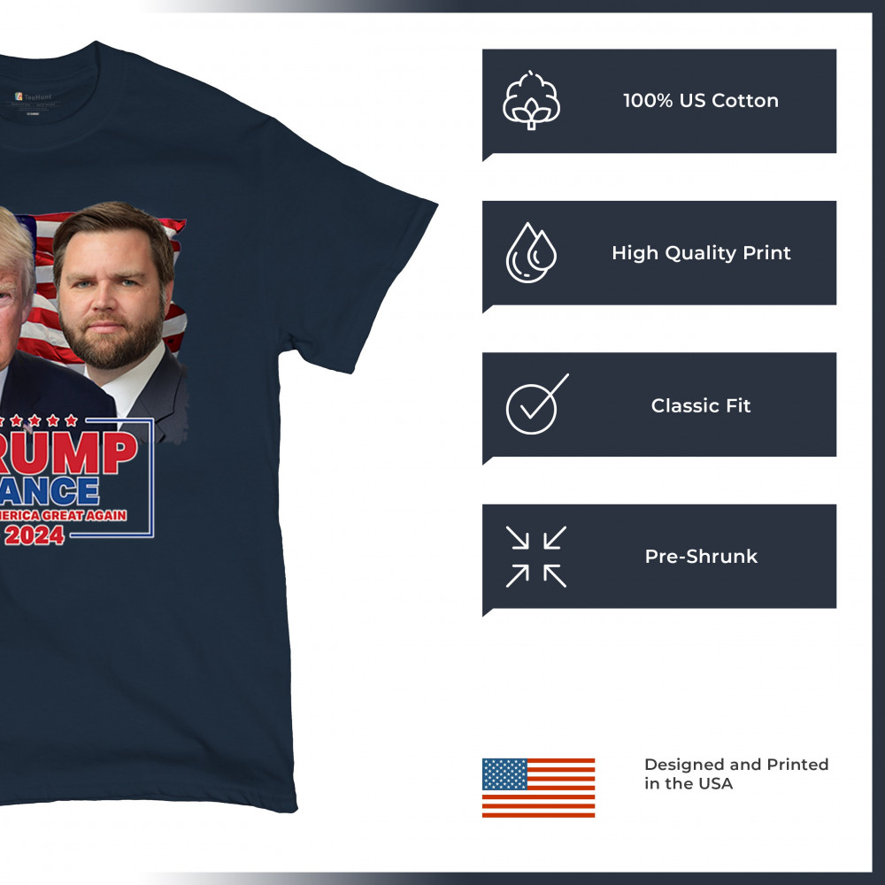 Support the Trump-Vance 2024 campaign with our exclusive design, featuring prominent images of Donald Trump and J.D. Vance set against the American flag. This design is perfect for rallies, political events, and daily wear, showcasing your dedication to the conservative movement. Its bold graphics and patriotic theme make it a standout piece for any supporter. Join the movement and proudly display your support with this dynamic and inspiring design.