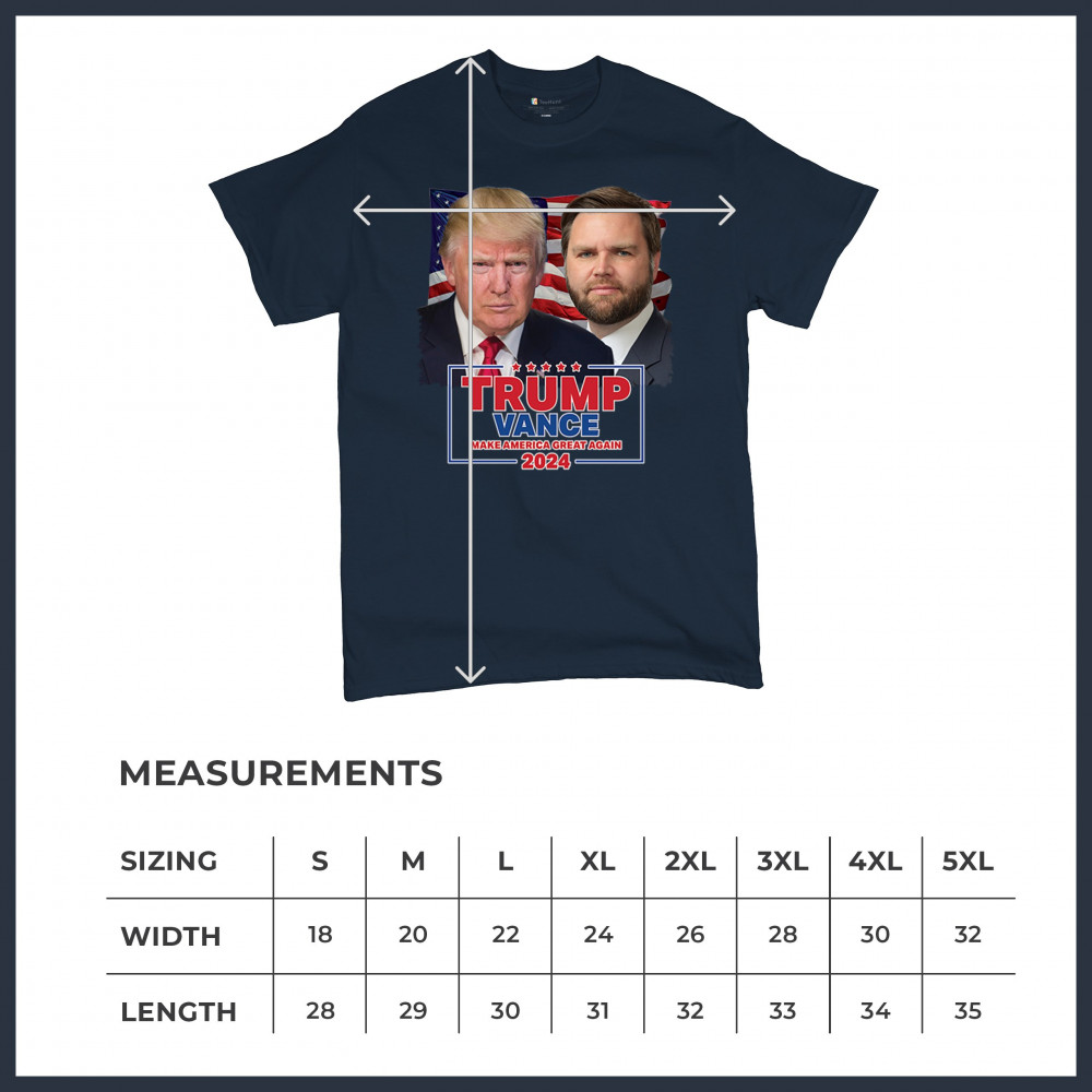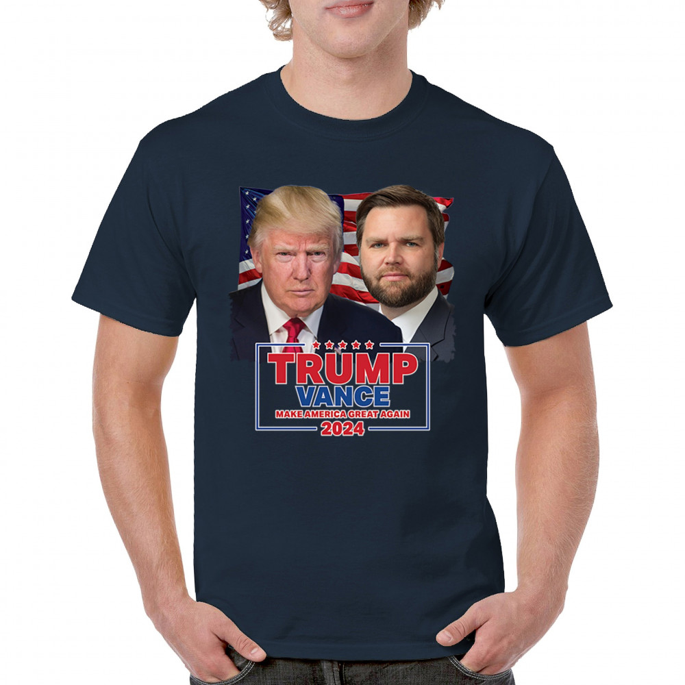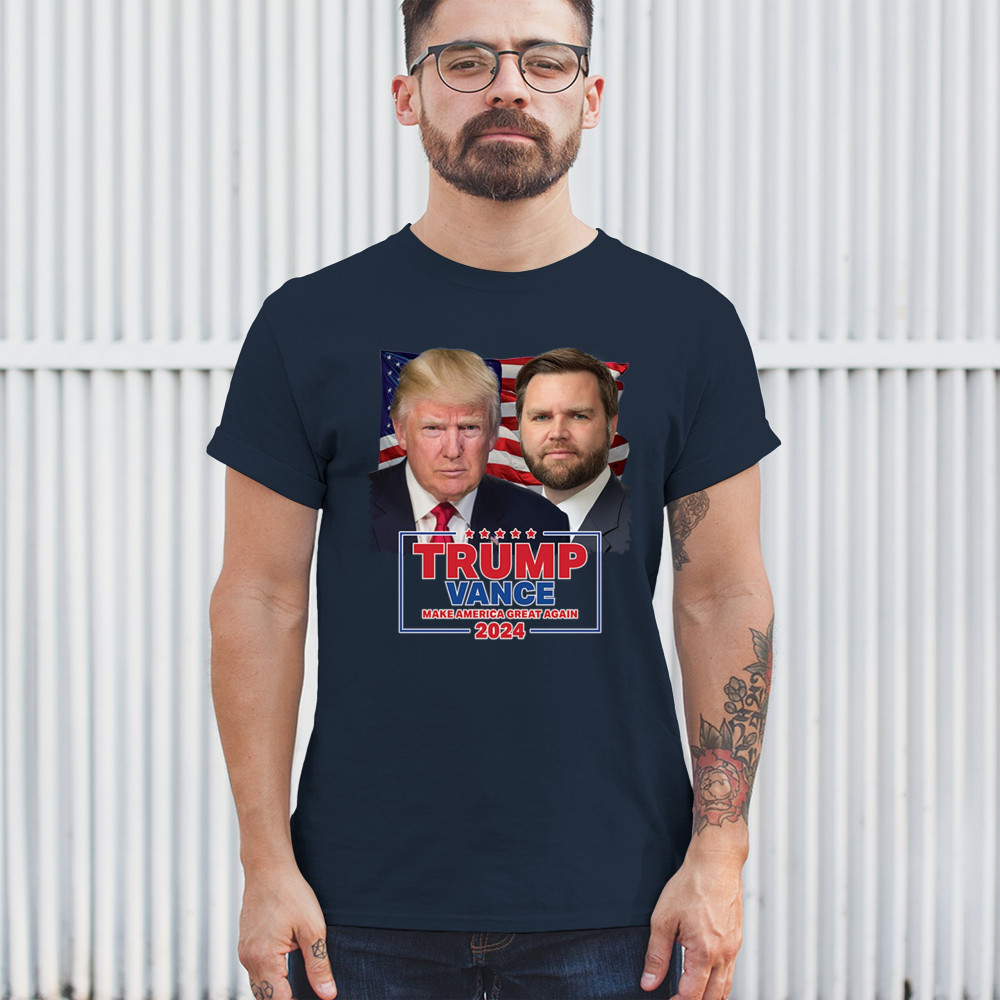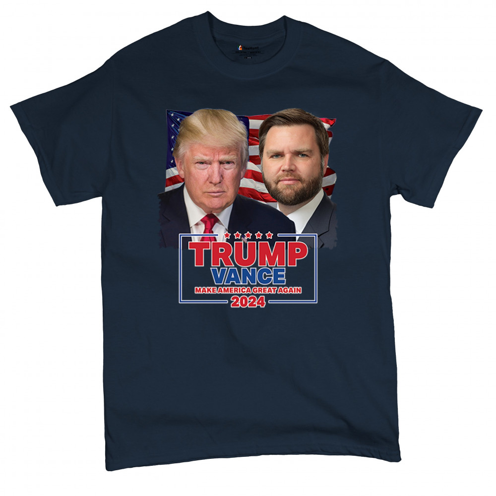 Show your support for Trump-Vance 2024 with this bold design featuring Trump and Vance against the American flag. Perfect for rallies and political events.
