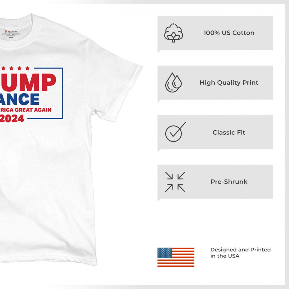 Express your support for the Trump-Vance 2024 campaign with this striking design that embodies American patriotism and conservative values. Featuring the American flag and the bold slogan "Trump Vance 2024," this design is perfect for rallies, political events, or daily wear. It’s a testament to your unwavering support for conservative ideals and the vision of making America great again. Join the movement and show your allegiance with this powerful and iconic design.