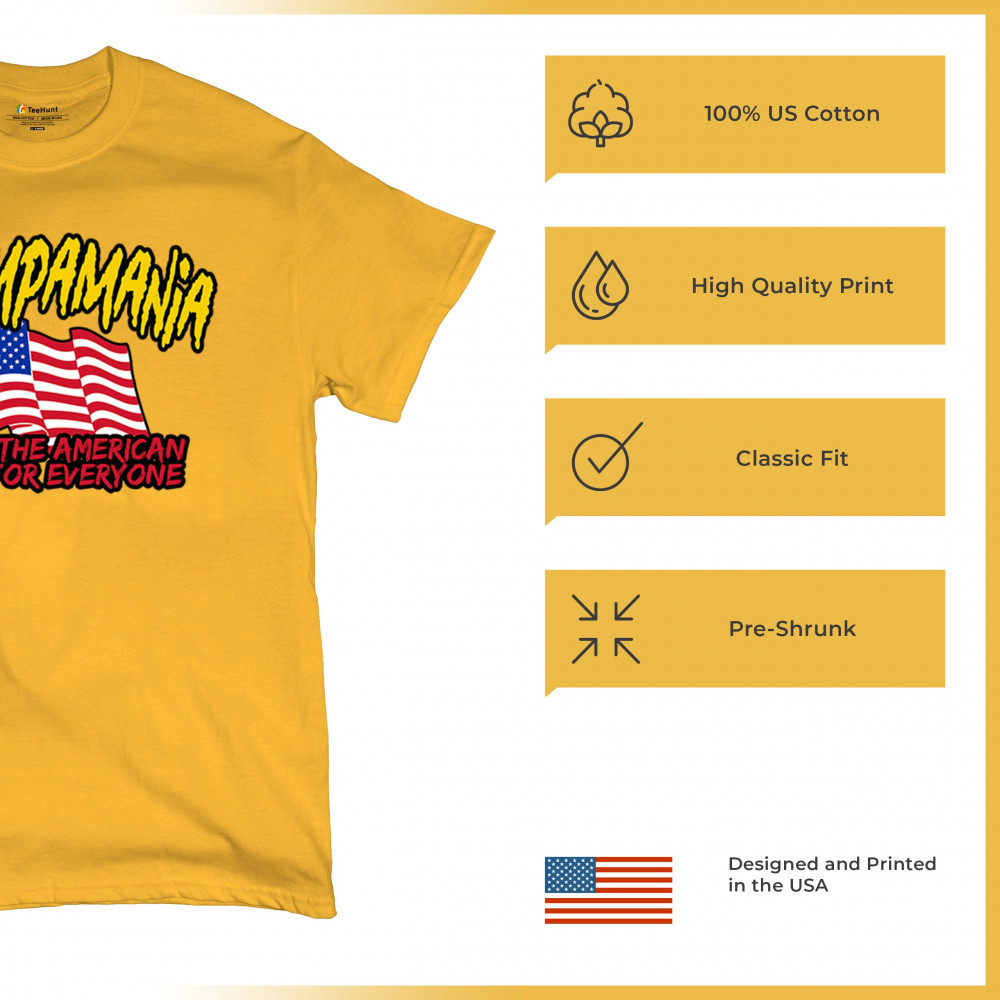 Show your patriotic pride with the "Trumpamania" design. Perfect for rallies, it embodies conservatism, trust in God, and the fight for America.