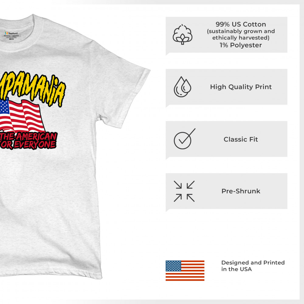 Show your patriotic pride with the "Trumpamania" design. Perfect for rallies, it embodies conservatism, trust in God, and the fight for America.