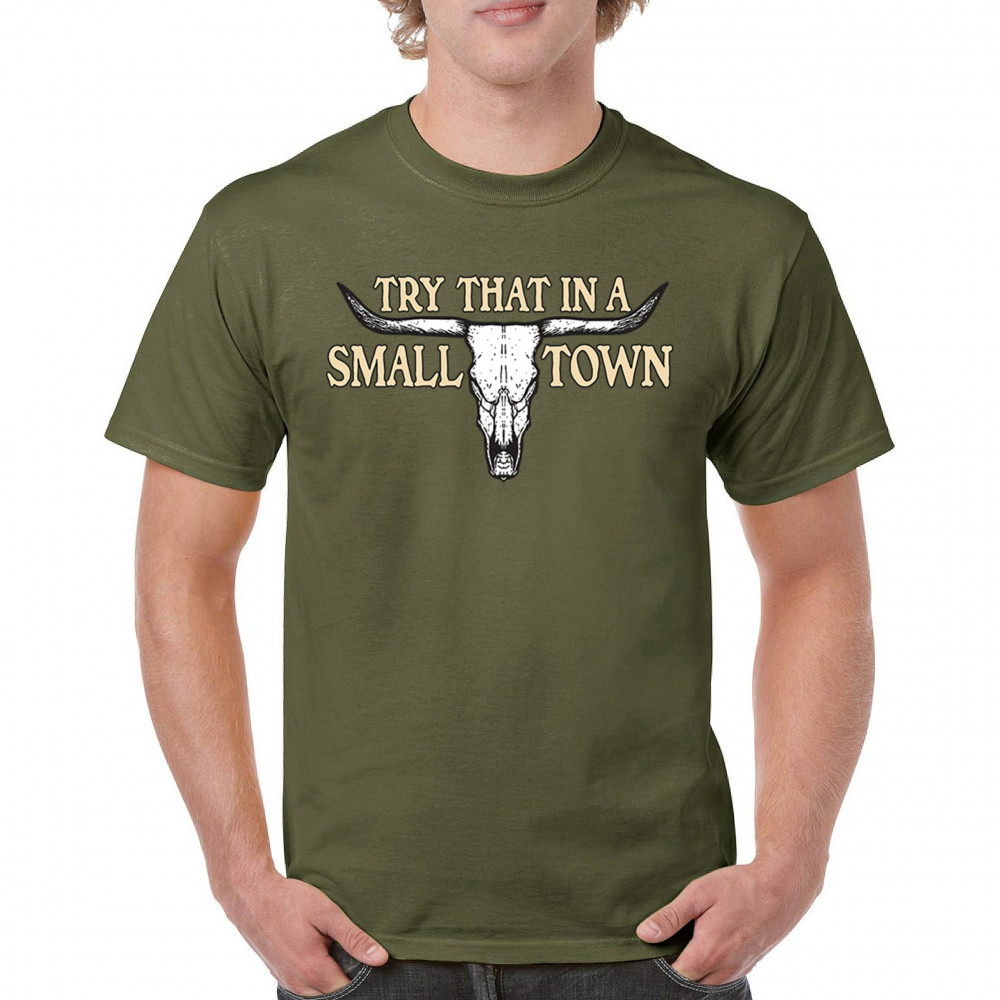 This design boldly proclaims "Try That in a SMALL TOWN," set against the backdrop of a stark cattle skull—a symbol deeply rooted in southern heritage and the undying American spirit. It's a tribute to the small-town sheriffs, the unwritten laws of backbone and duty, and the patriotic fervor that runs through the country's veins. Whether you're a motorcycle enthusiast, a Republican, or simply a connoisseur of all things vintage, this piece is a testament to enduring strength and local pride.