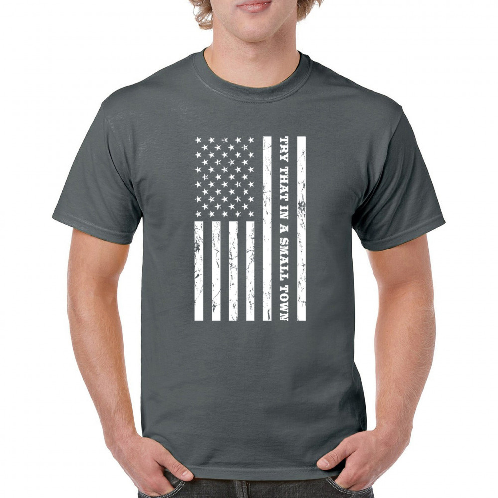 TRY THAT IN A SMALL TOWN GRUNGE AMERICAN FLAG t-shirt patriotic men's tee charcoal