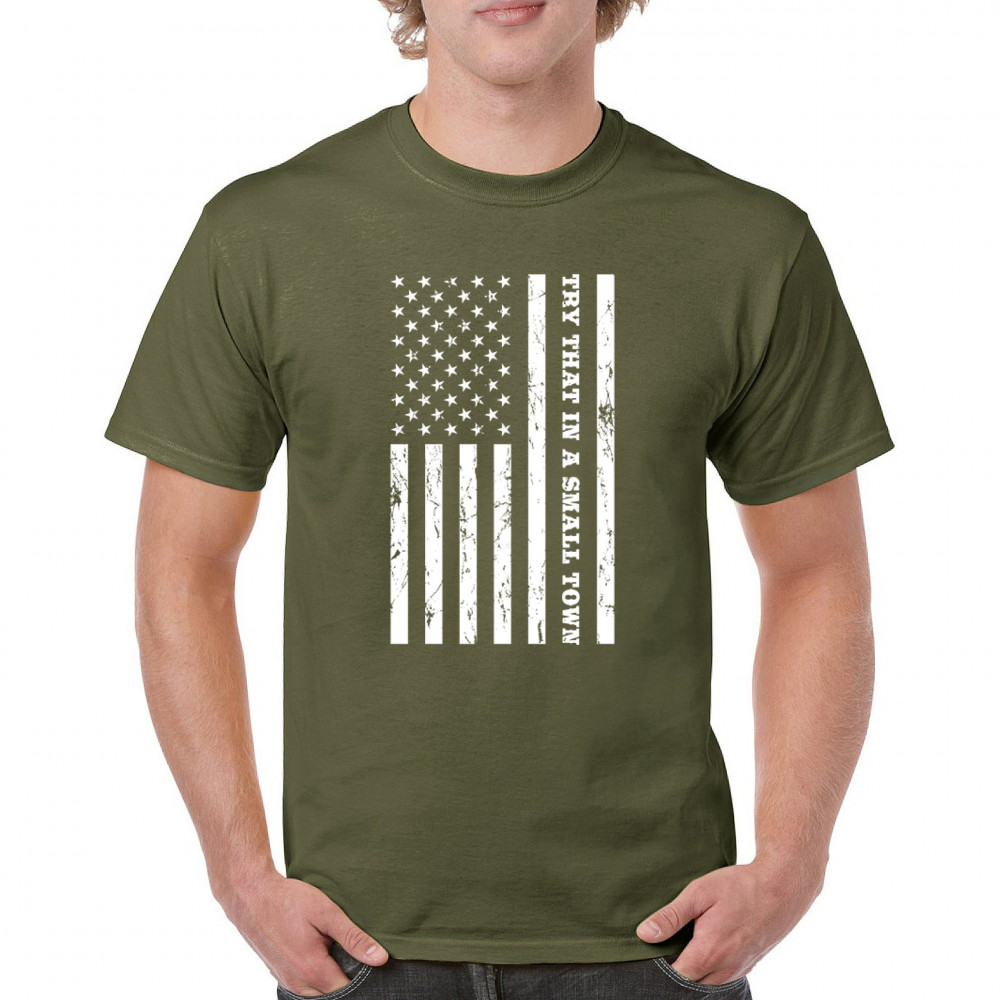 TRY THAT IN A SMALL TOWN GRUNGE AMERICAN FLAG t-shirt patriotic men's tee military green