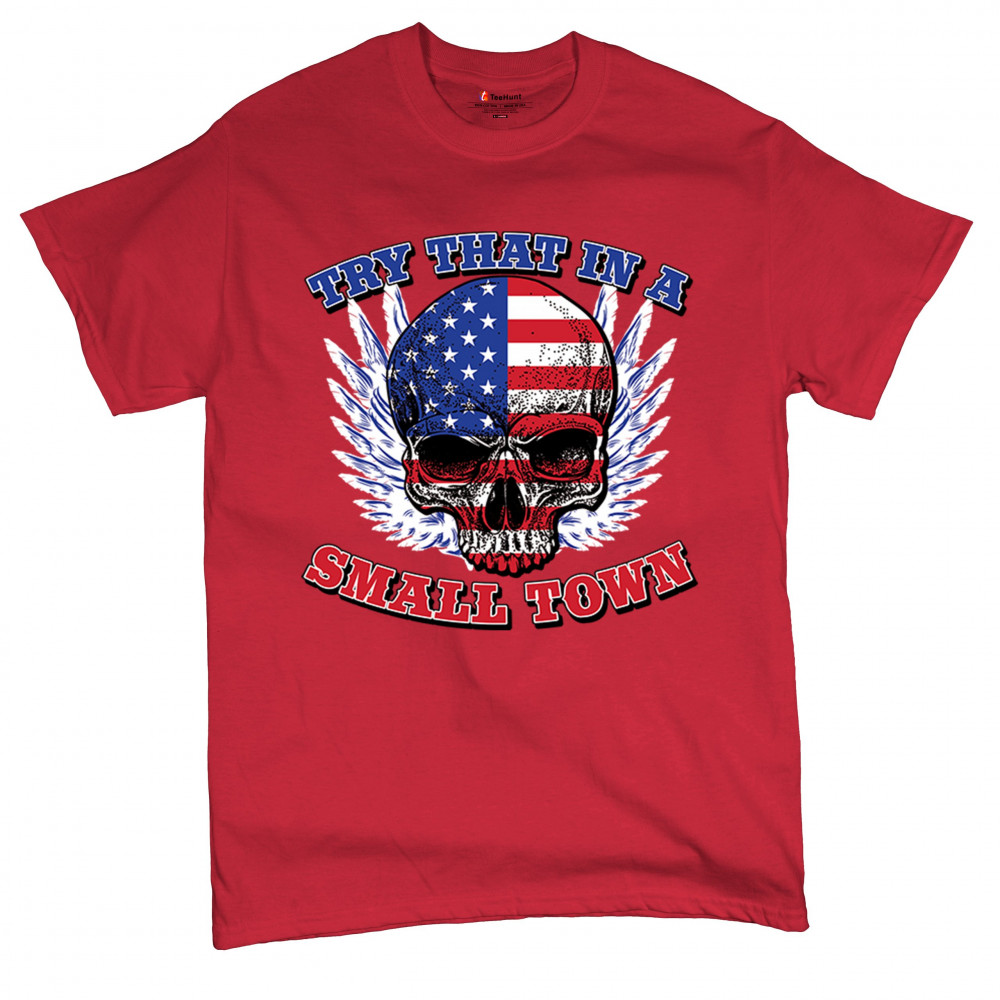 TRY THAT IN A SMALL TOWN t-shirt american flag skull country music men's tee red