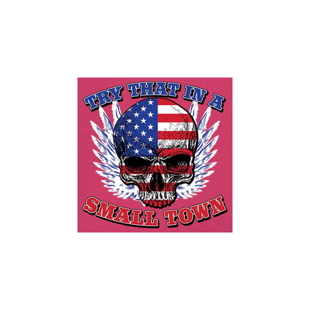TRY THAT IN A SMALL TOWN t-shirt american flag skull country music men's tee hot pink