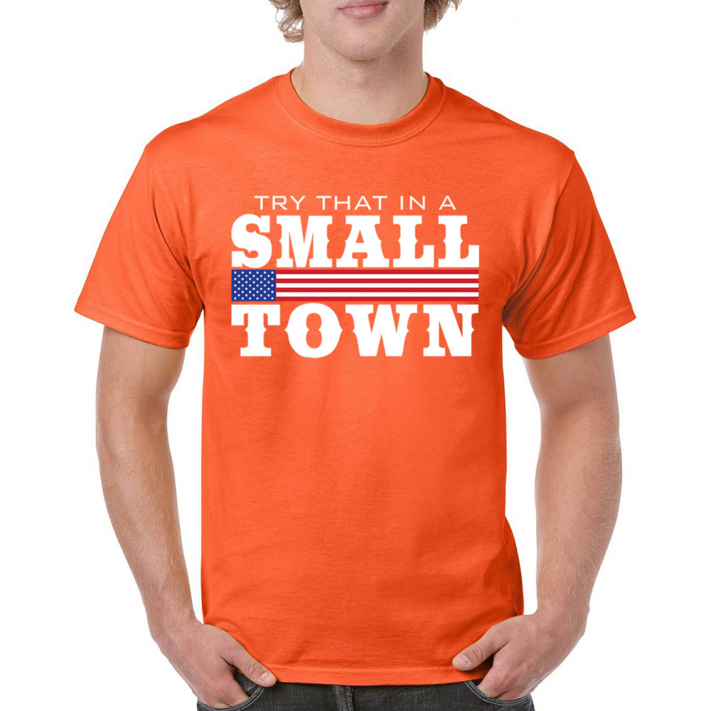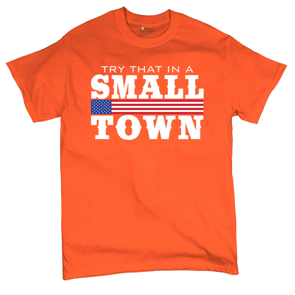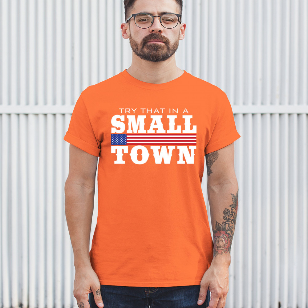 Celebrate small-town pride with our "Try That In A Small Town" design. Perfect for patriotic events, it features a bold American flag graphic.