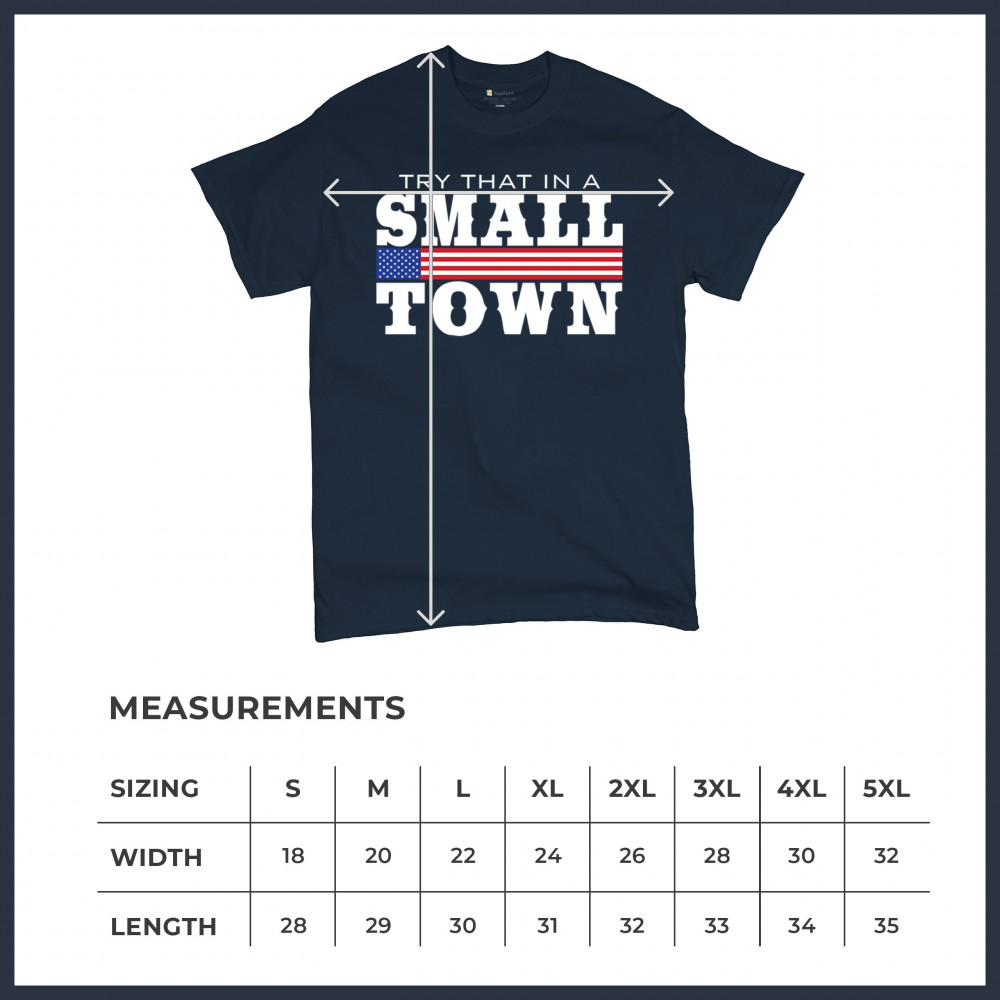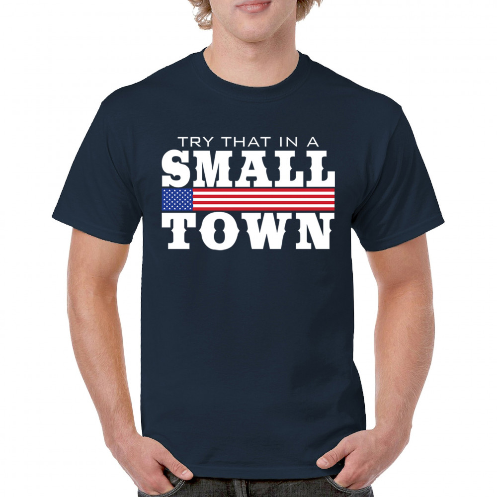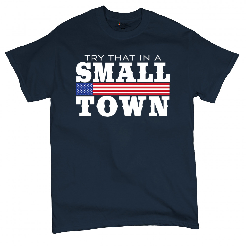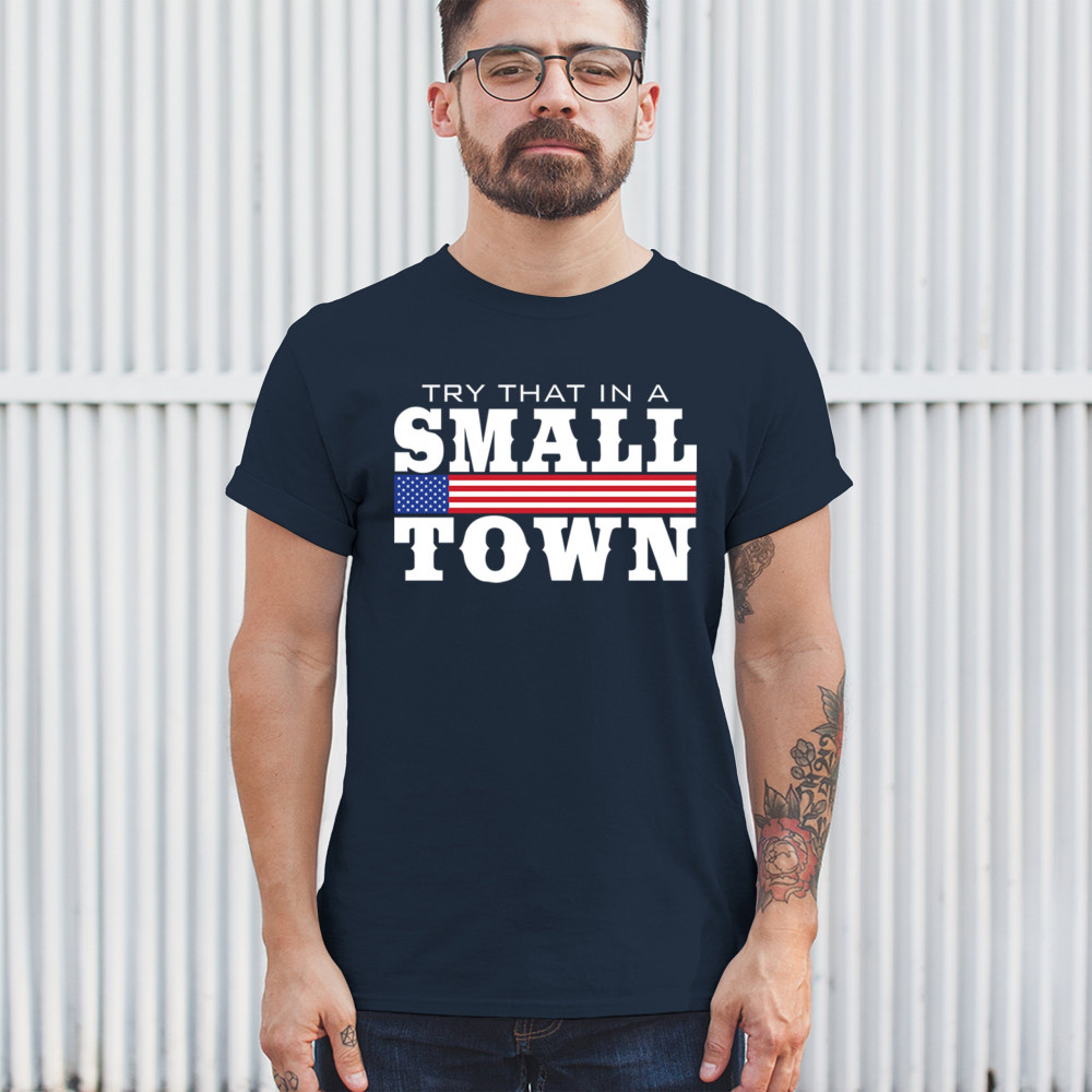 Celebrate small-town pride with our "Try That In A Small Town" design. Perfect for patriotic events, it features a bold American flag graphic.