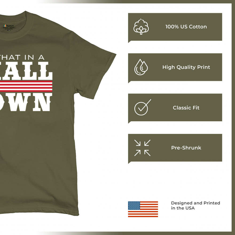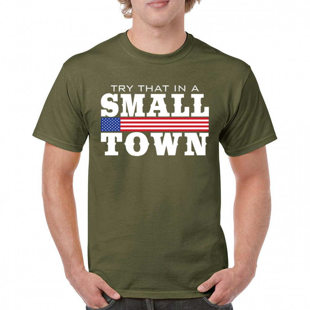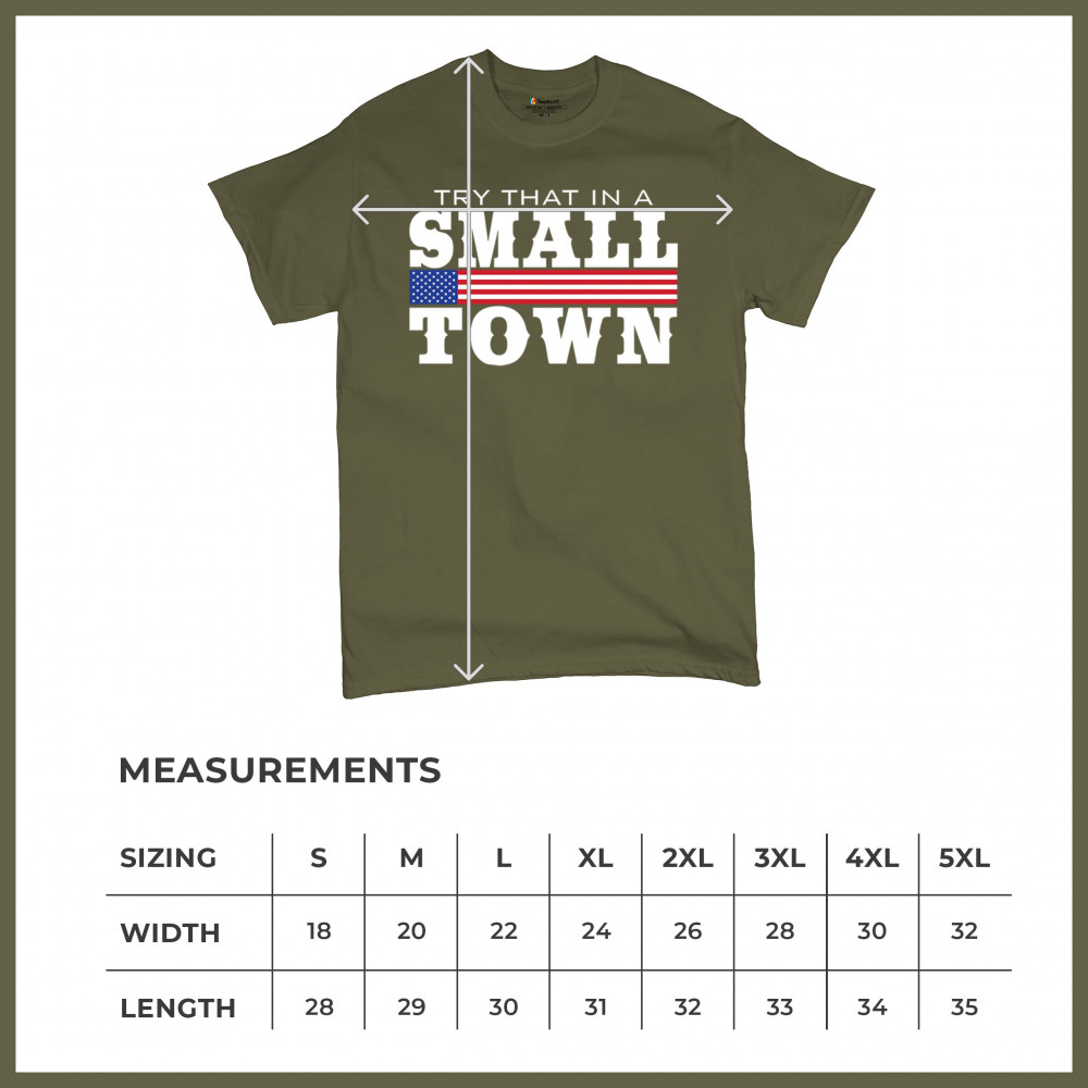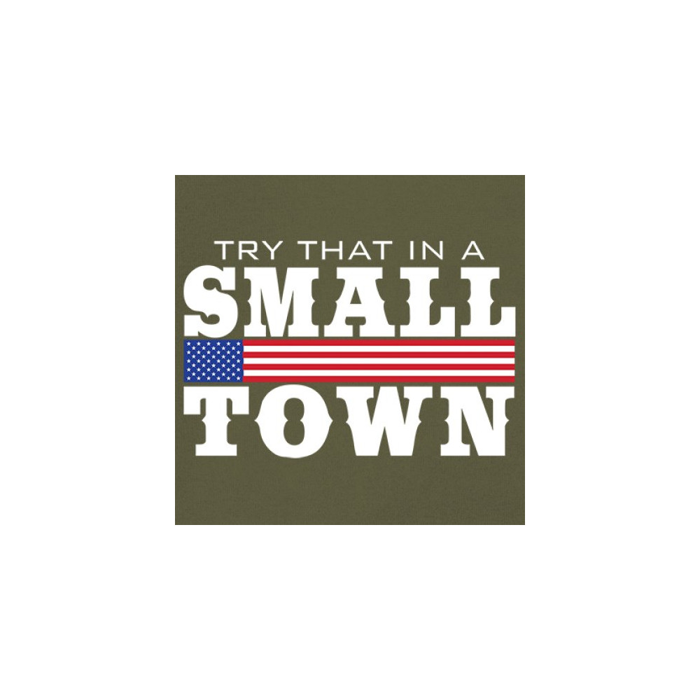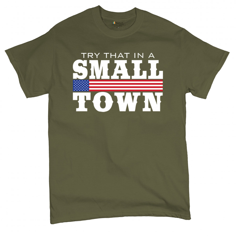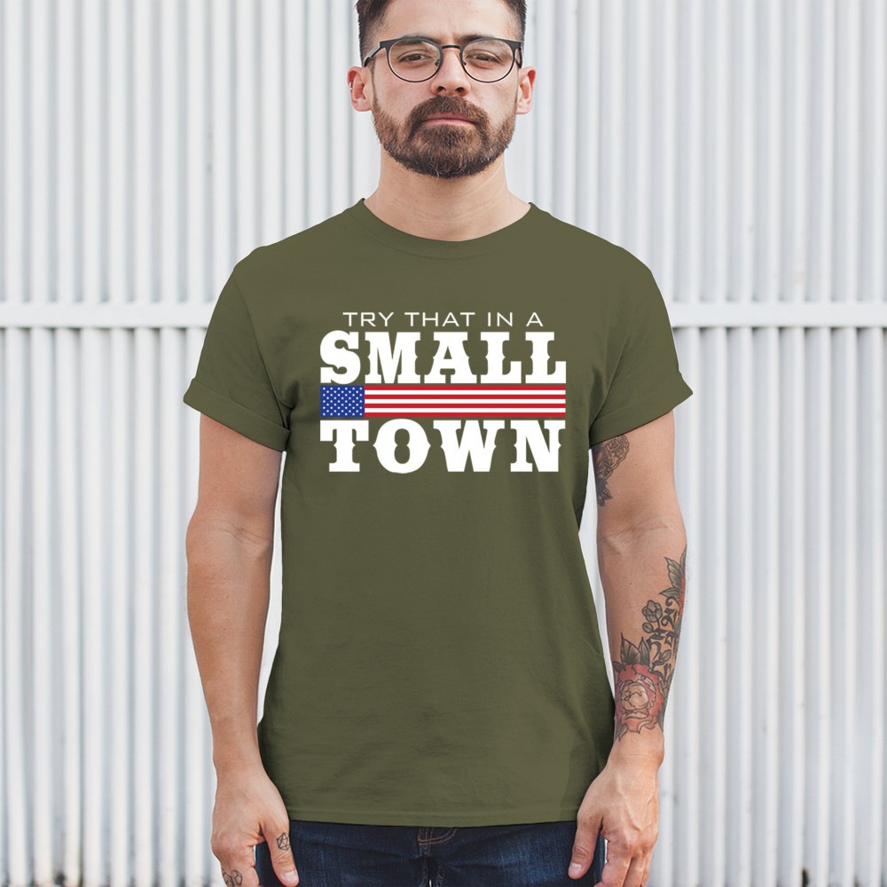 Celebrate small-town pride with our "Try That In A Small Town" design. Perfect for patriotic events, it features a bold American flag graphic.