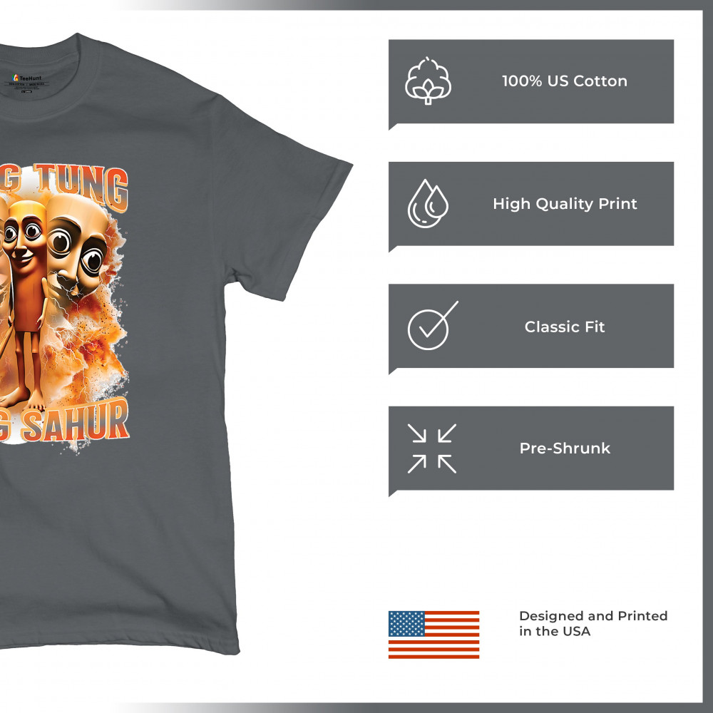 Brace yourself for pure meme insanity with the Tung Tung Tung Sahur shirt—a cursed-core fever dream built from TikTok chaos and Gen Z humor. This design blends internet meme culture, ironic fashion, brainrot visuals, and Gen Alpha absurdity. Perfect for those who wear memes, laugh at chaos, and live for viral trends.