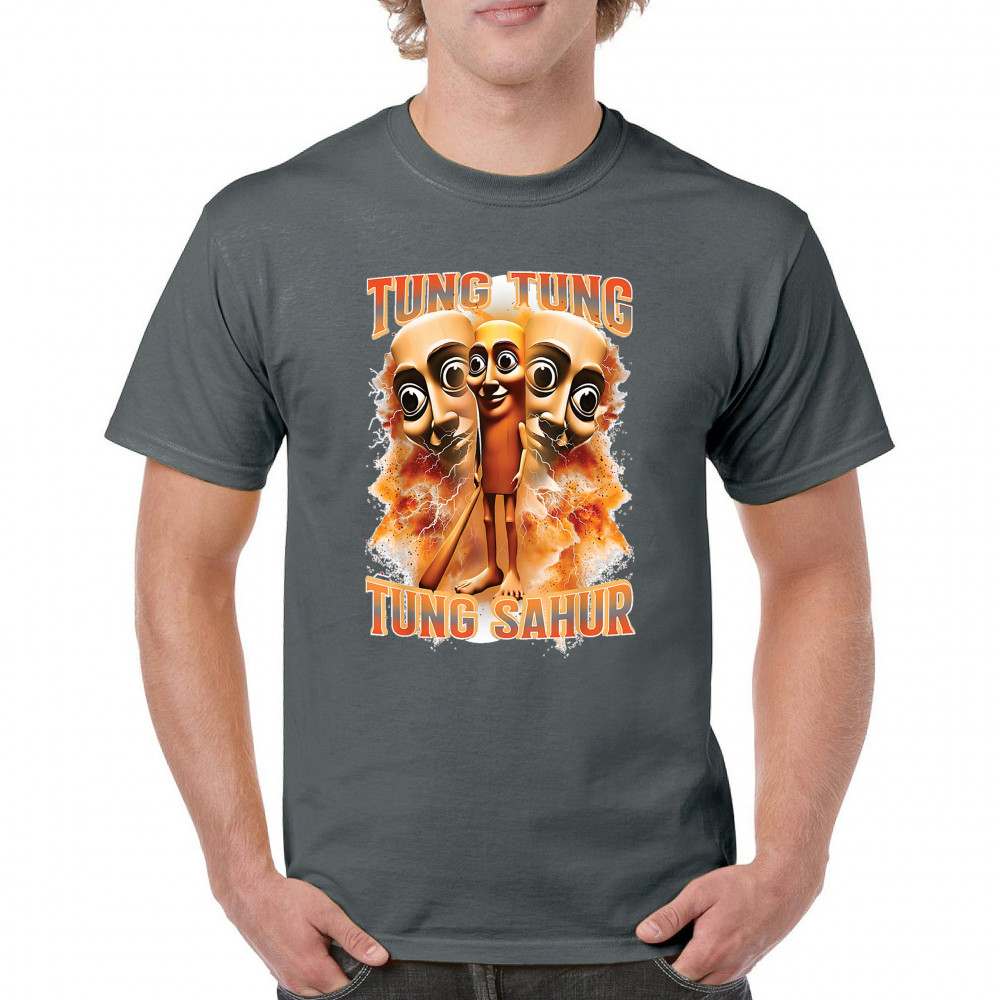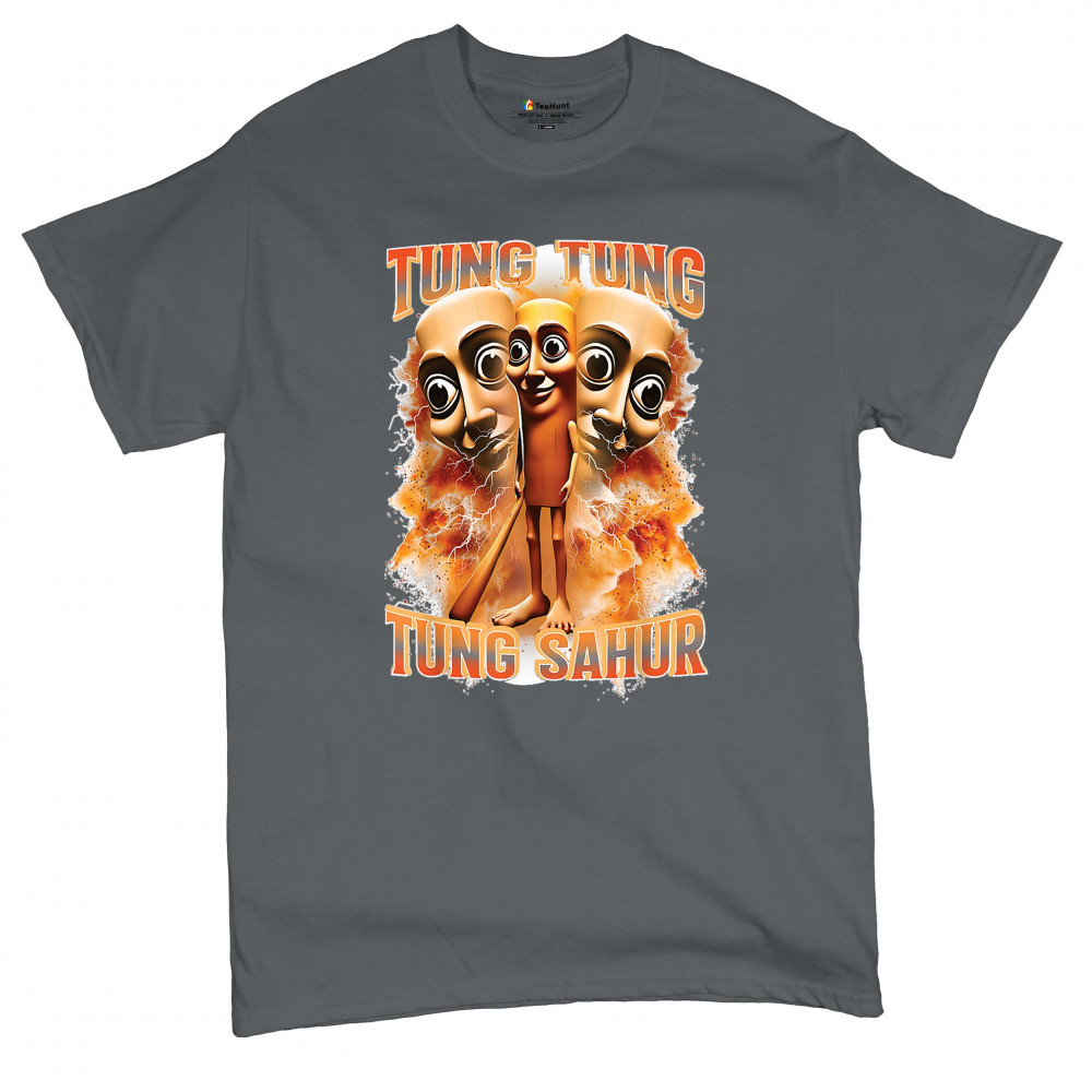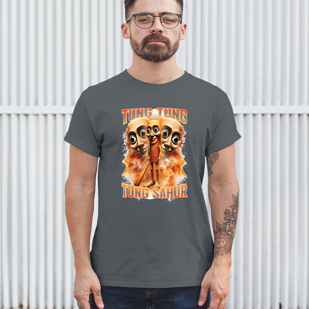 Tung Tung Tung Sahur design blends cursed-core, meme humor, Gen Z fashion, ironic style, and viral brainrot absurdity into one wild tee.