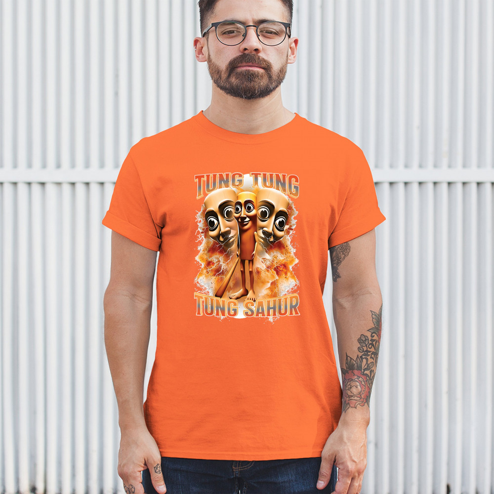 Tung Tung Tung Sahur design blends cursed-core, meme humor, Gen Z fashion, ironic style, and viral brainrot absurdity into one wild tee.