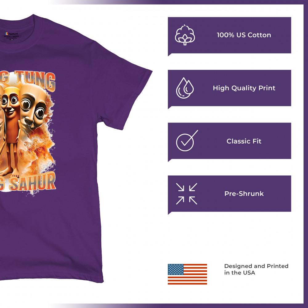 Brace yourself for pure meme insanity with the Tung Tung Tung Sahur shirt—a cursed-core fever dream built from TikTok chaos and Gen Z humor. This design blends internet meme culture, ironic fashion, brainrot visuals, and Gen Alpha absurdity. Perfect for those who wear memes, laugh at chaos, and live for viral trends.