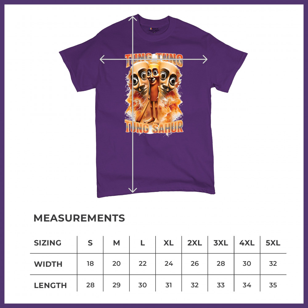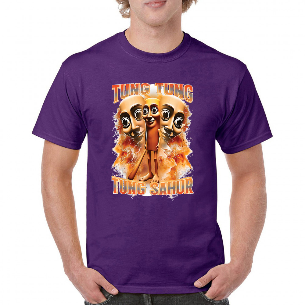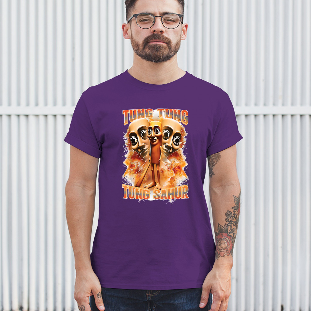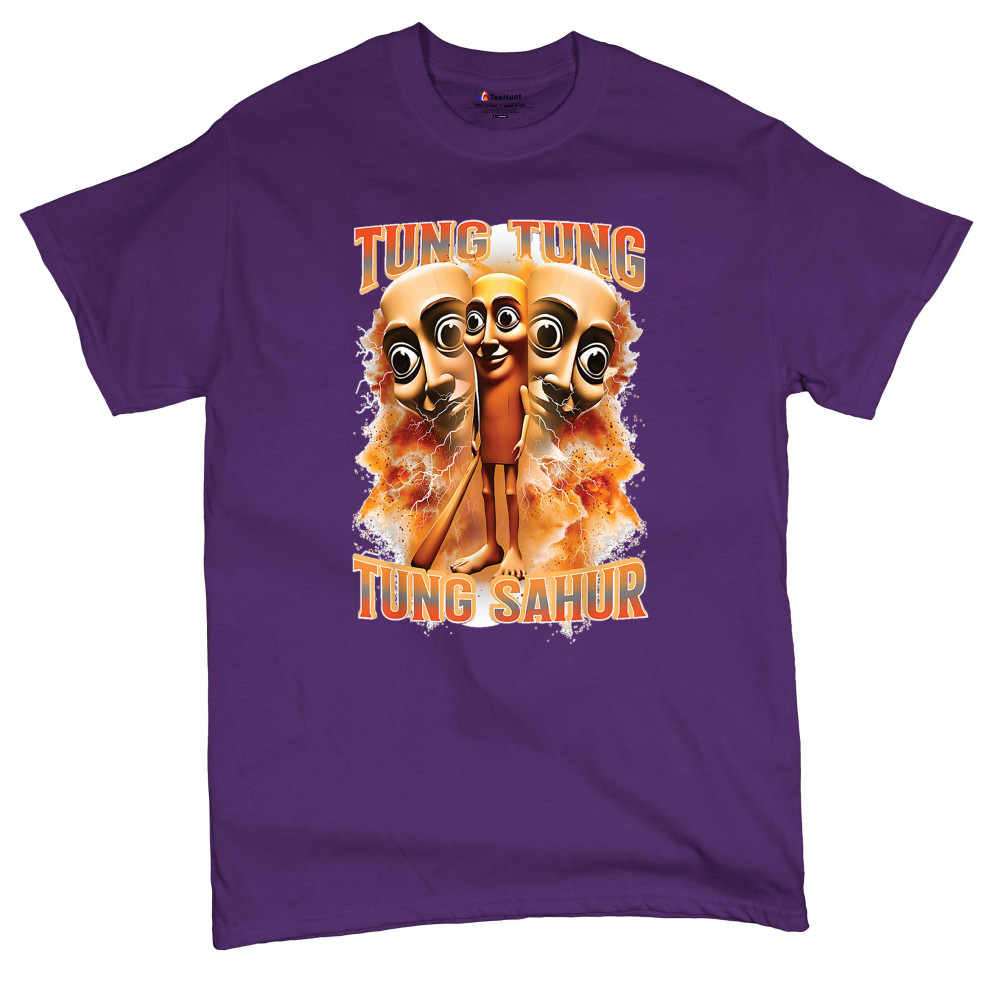 Tung Tung Tung Sahur design blends cursed-core, meme humor, Gen Z fashion, ironic style, and viral brainrot absurdity into one wild tee.