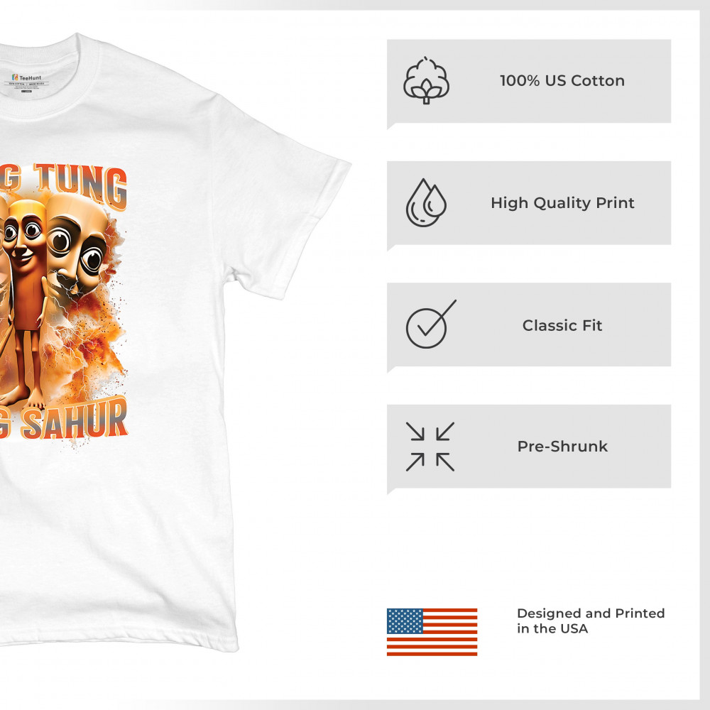Brace yourself for pure meme insanity with the Tung Tung Tung Sahur shirt—a cursed-core fever dream built from TikTok chaos and Gen Z humor. This design blends internet meme culture, ironic fashion, brainrot visuals, and Gen Alpha absurdity. Perfect for those who wear memes, laugh at chaos, and live for viral trends.