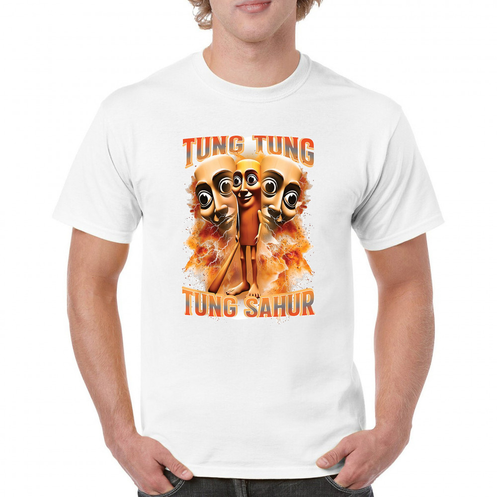 Tung Tung Tung Sahur design blends cursed-core, meme humor, Gen Z fashion, ironic style, and viral brainrot absurdity into one wild tee.