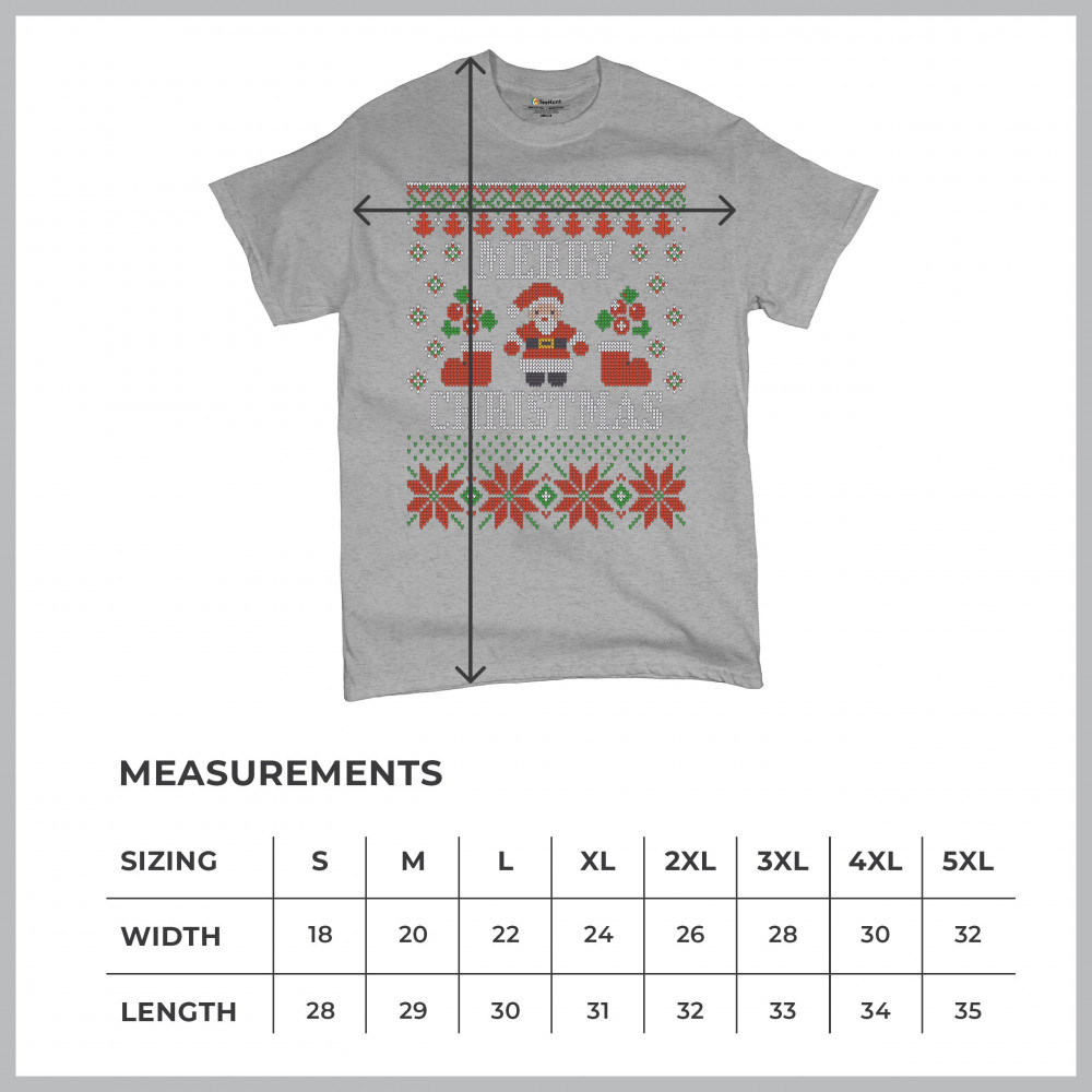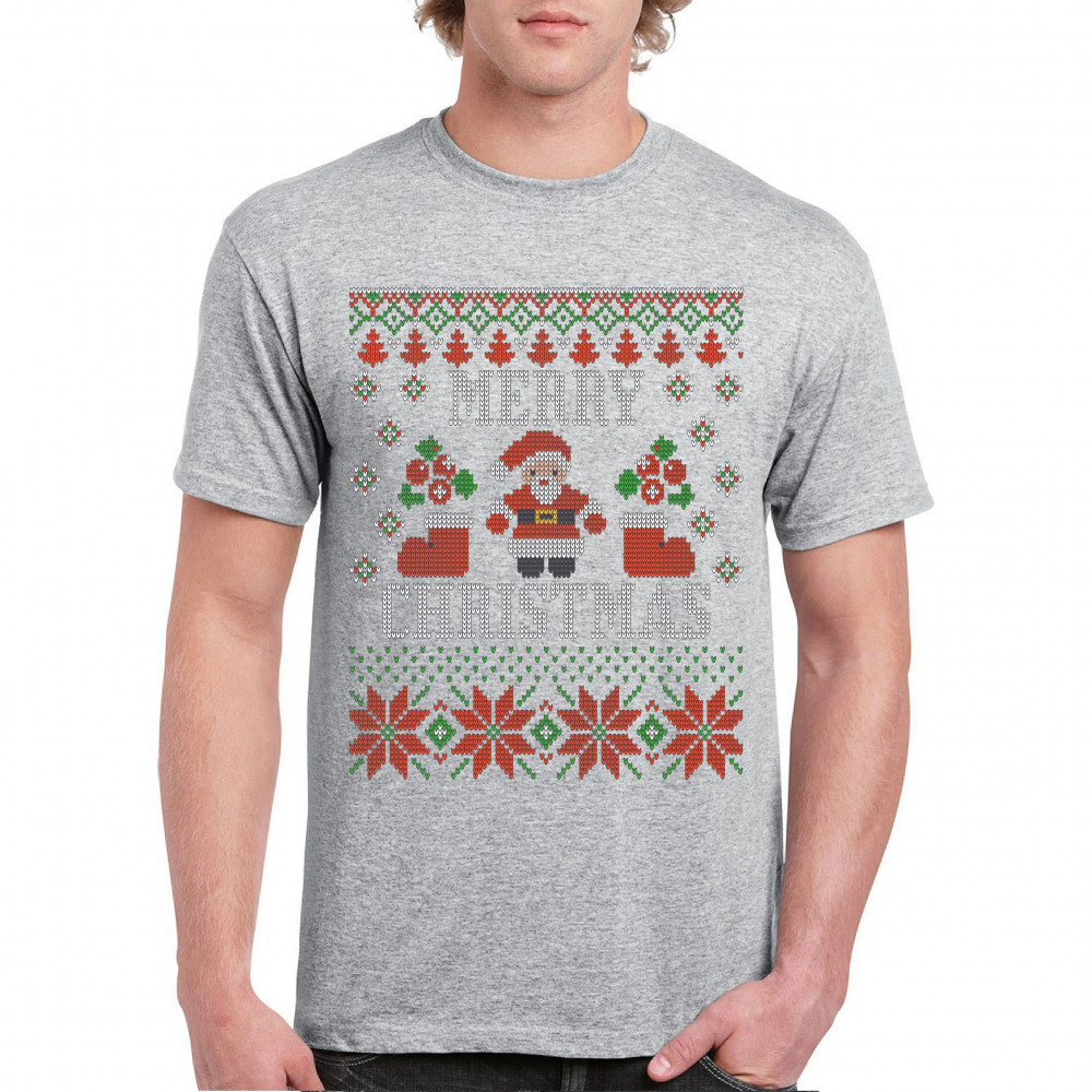 A print saying: "Merry Christmas" and depicting Santa Claus, two Christmas socks, multiple snowflakes and Christmas trees. The print is decorated as an ugly sweater. A great choice for a Christmas eve celebration.