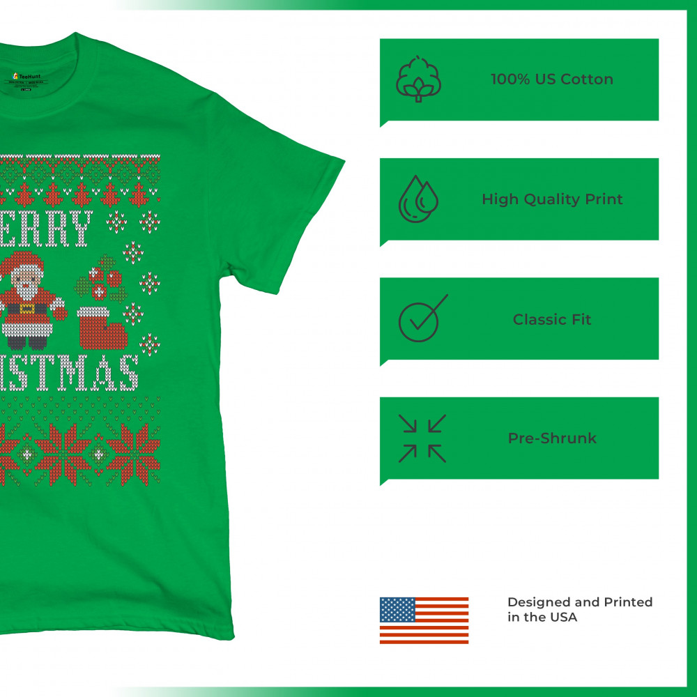 A print saying: "Merry Christmas" and depicting Santa Claus, two Christmas socks, multiple snowflakes and Christmas trees. The print is decorated as an ugly sweater. A great choice for a Christmas eve celebration.