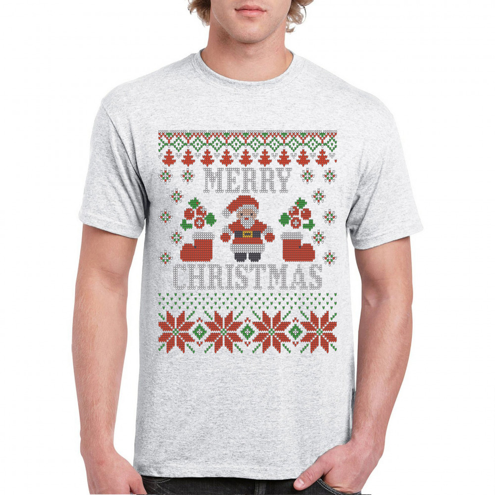 A print saying: "Merry Christmas" and depicting Santa Claus, two Christmas socks, multiple snowflakes and Christmas trees. The print is decorated as an ugly sweater. A great choice for a Christmas eve celebration.