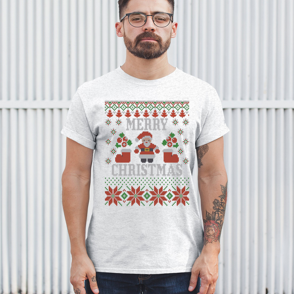 UGLY SWEATER SANTA CLAUS t-shirt let it snow christmas jingle bells men's tee ash gray
