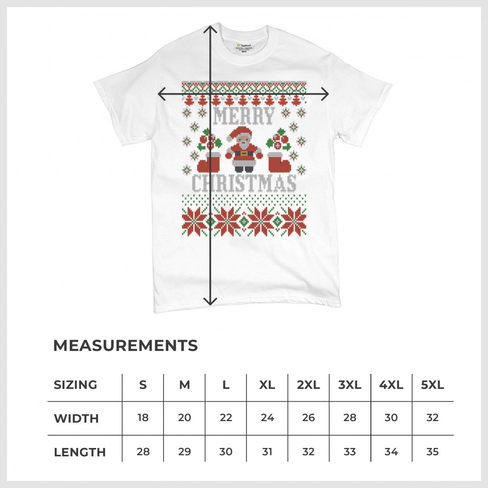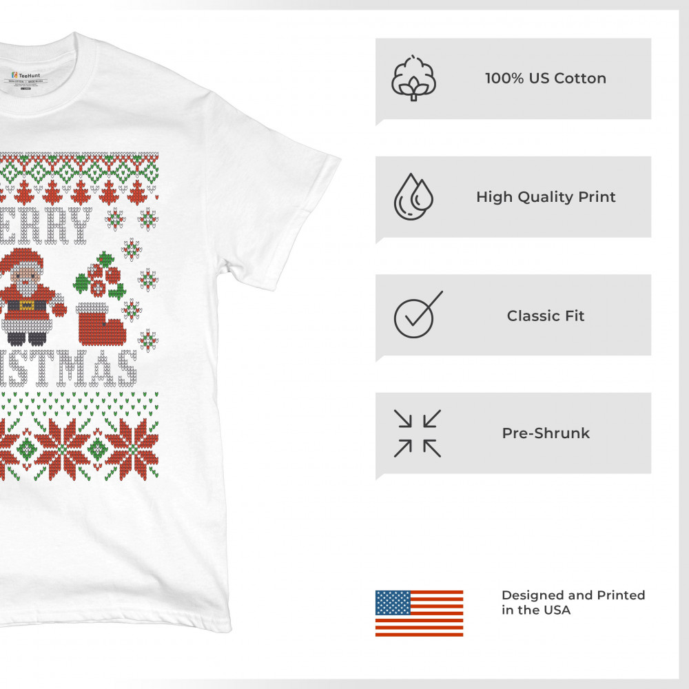 A print saying: "Merry Christmas" and depicting Santa Claus, two Christmas socks, multiple snowflakes and Christmas trees. The print is decorated as an ugly sweater. A great choice for a Christmas eve celebration.