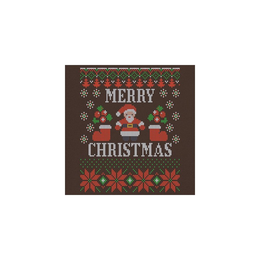 A print saying: "Merry Christmas" and depicting Santa Claus, two Christmas socks, multiple snowflakes and Christmas trees. The print is decorated as an ugly sweater. A great choice for a Christmas eve celebration.