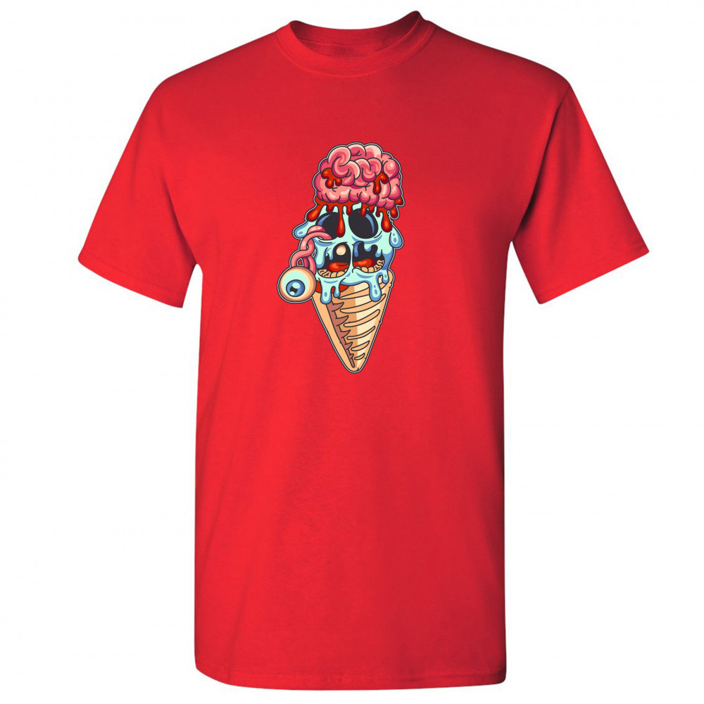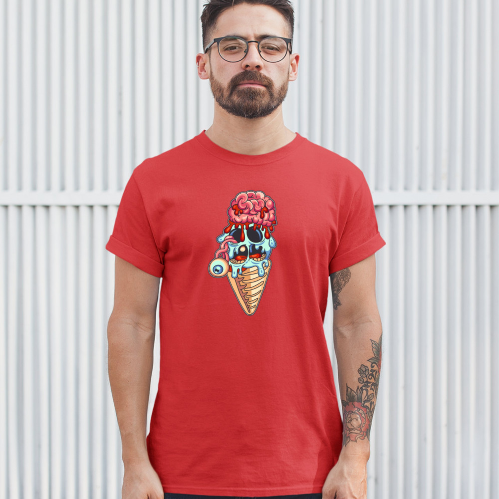 A print featuring an undead ice cream. The ice cream ball looks like a head of a zombie with an eye popping out and hanging and bloodied brains attached on top. A great choice for a person who is into horror movies, haunted houses and freaking people out!