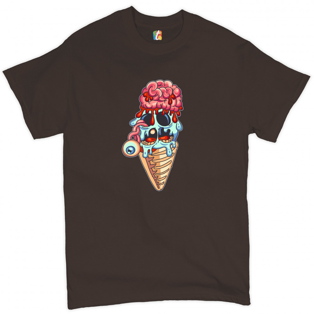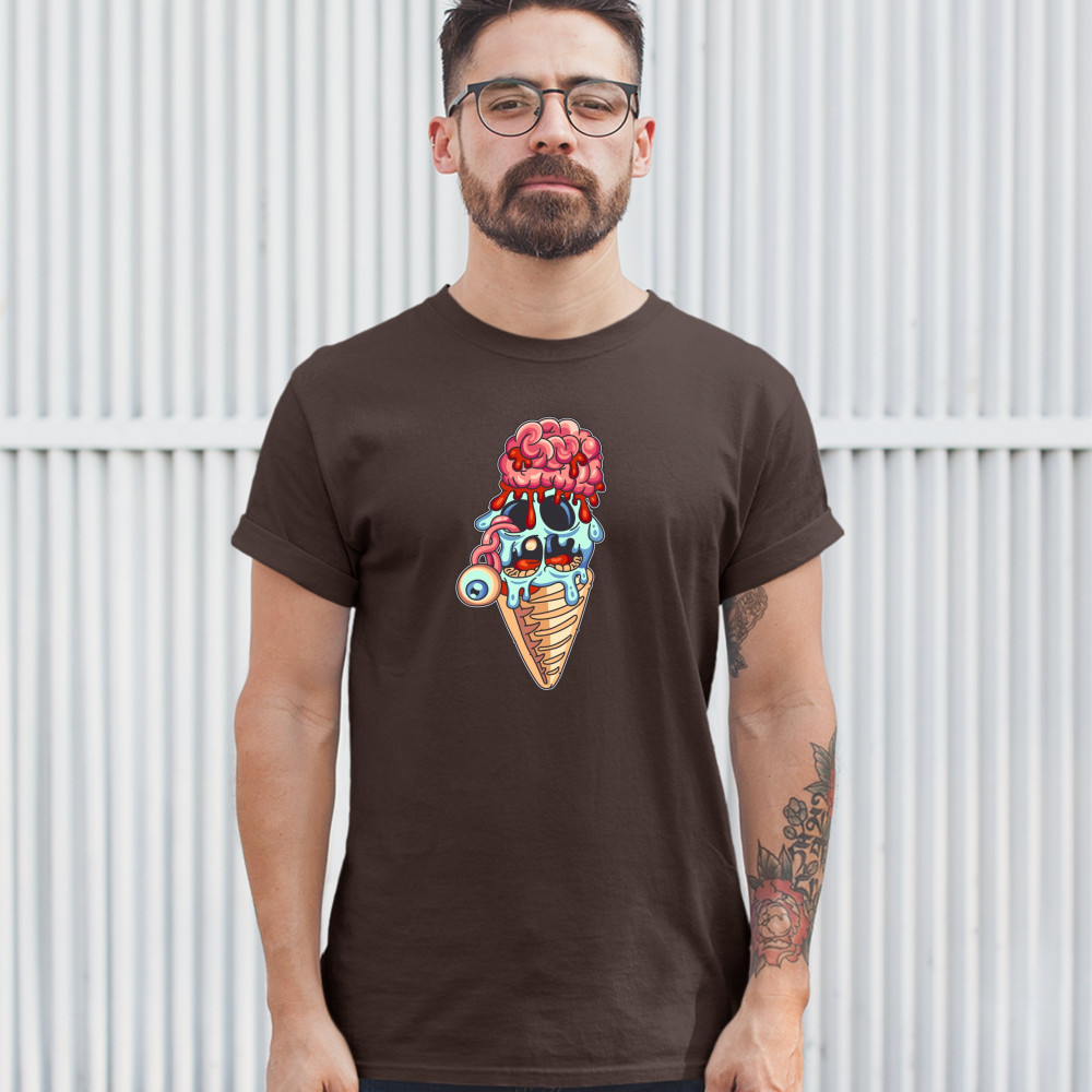 A print featuring an undead ice cream. The ice cream ball looks like a head of a zombie with an eye popping out and hanging and bloodied brains attached on top. A great choice for a person who is into horror movies, haunted houses and freaking people out!