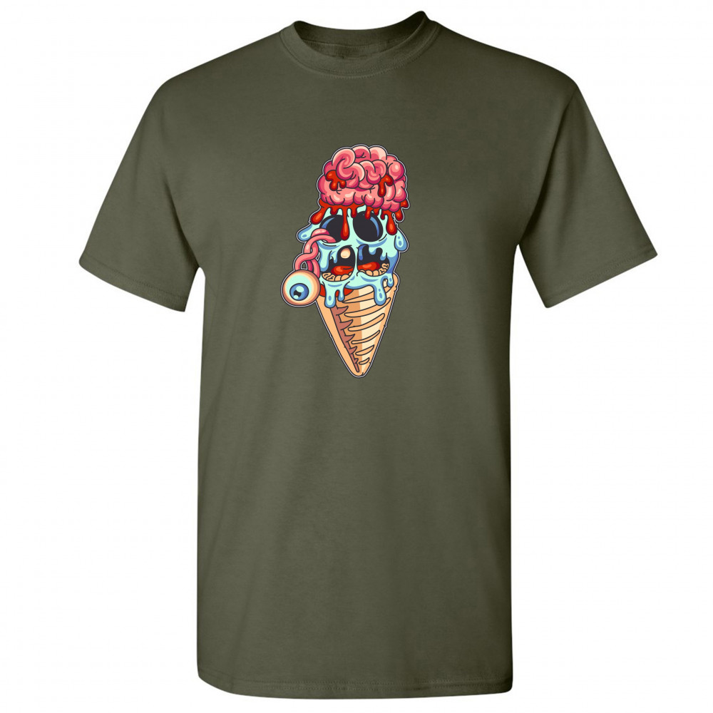 A print featuring an undead ice cream. The ice cream ball looks like a head of a zombie with an eye popping out and hanging and bloodied brains attached on top. A great choice for a person who is into horror movies, haunted houses and freaking people out!