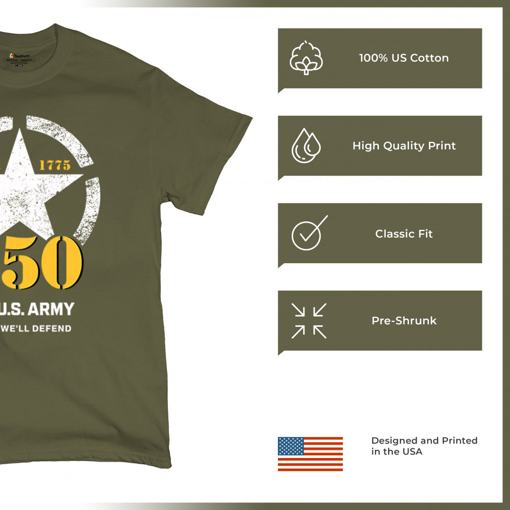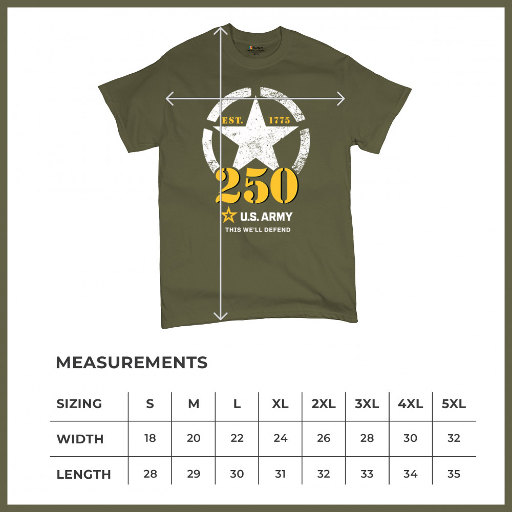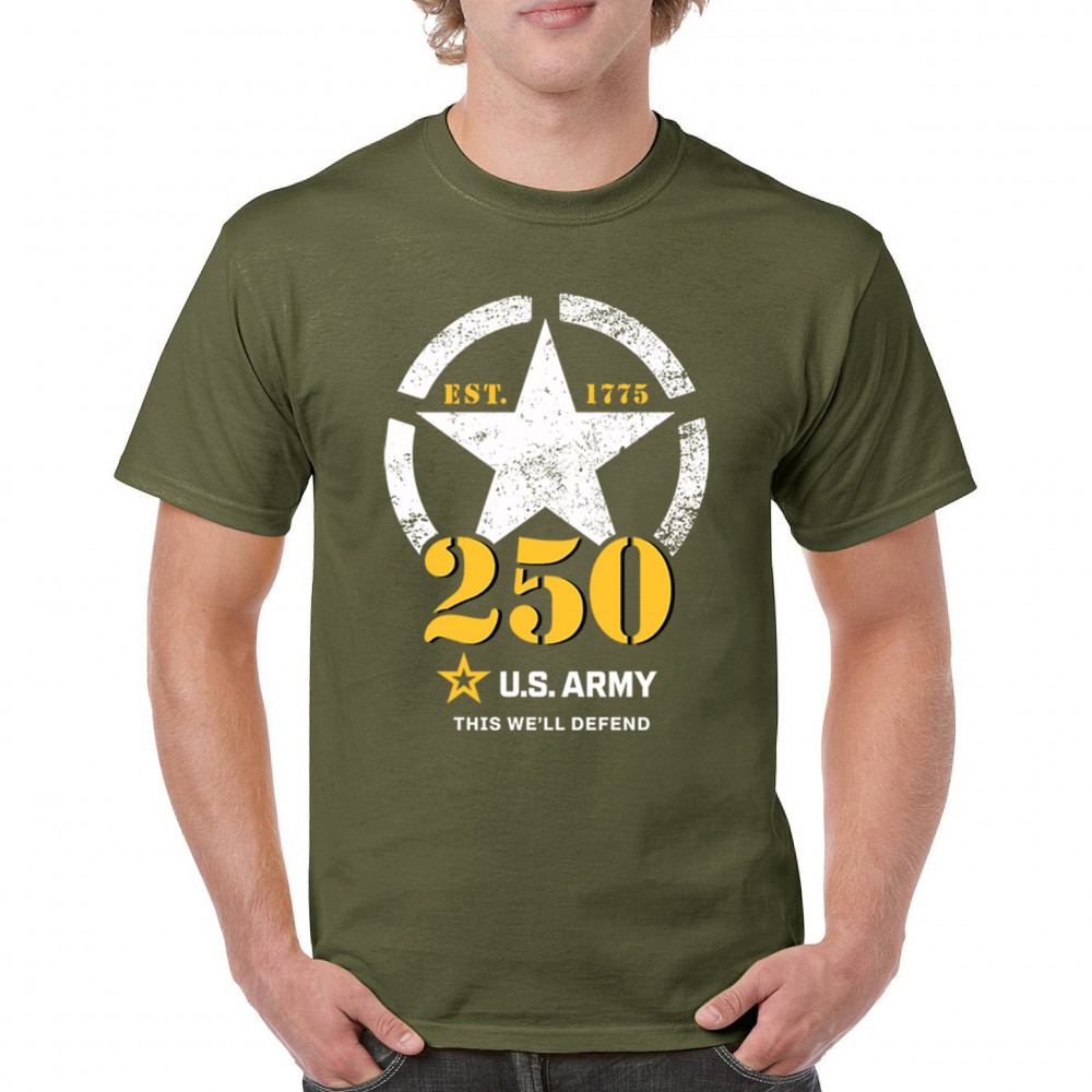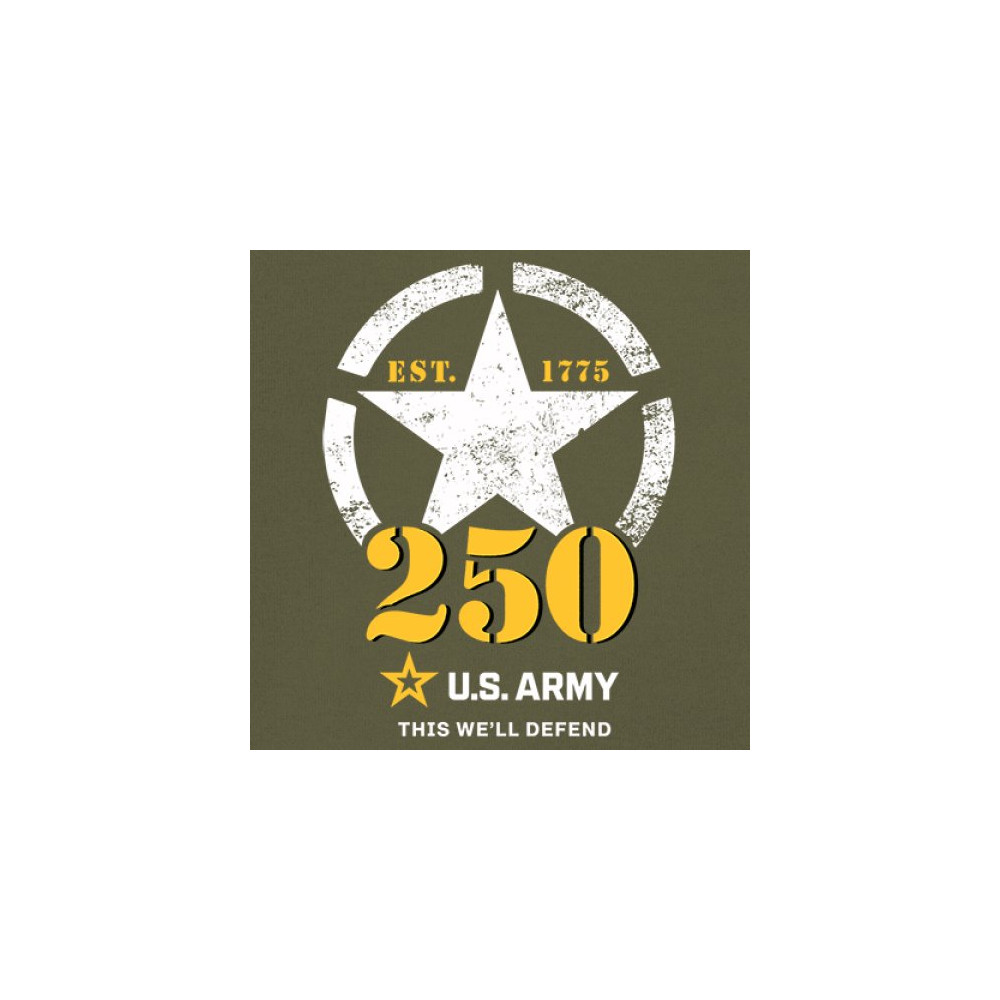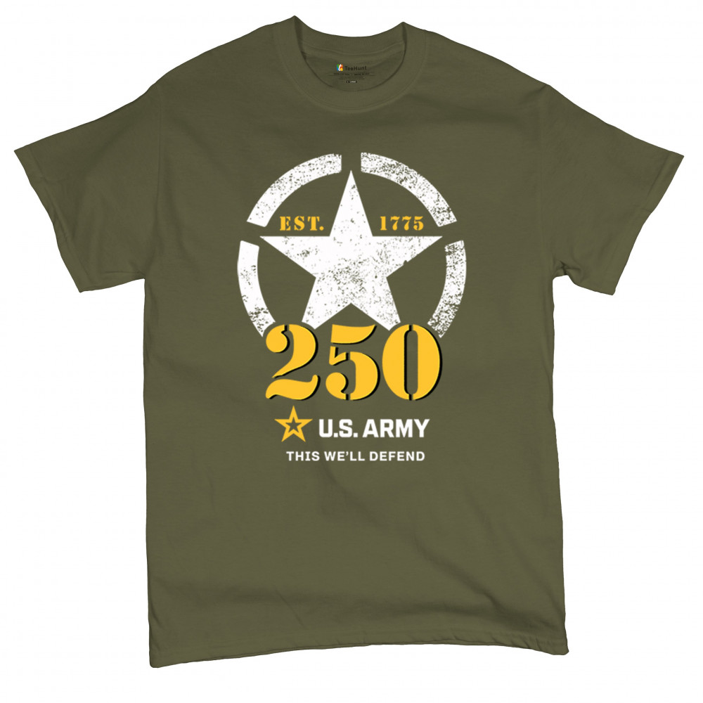 Celebrate 250 years of U.S. Army duty and pride with bold stencil design, EST 1775 mark, and patriotic “This We’ll Defend†motto.