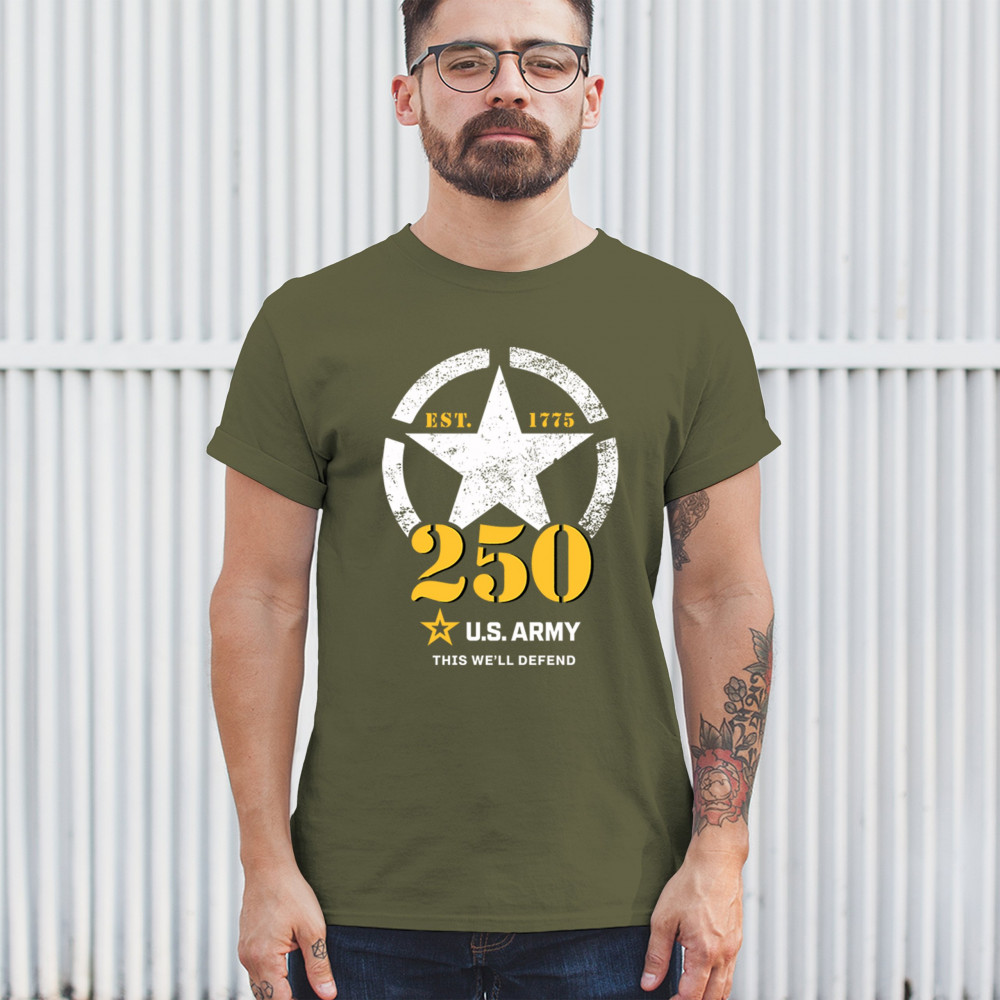 Boldly marking the U.S. Army’s 250th anniversary, this design includes a distressed white star, 1775 EST detail, and bold yellow “250†typeface beneath the iconic motto “This We’ll Defend.†A fitting tribute for veterans, service members, and families who want to show respect and pride during military observances or patriotic events.