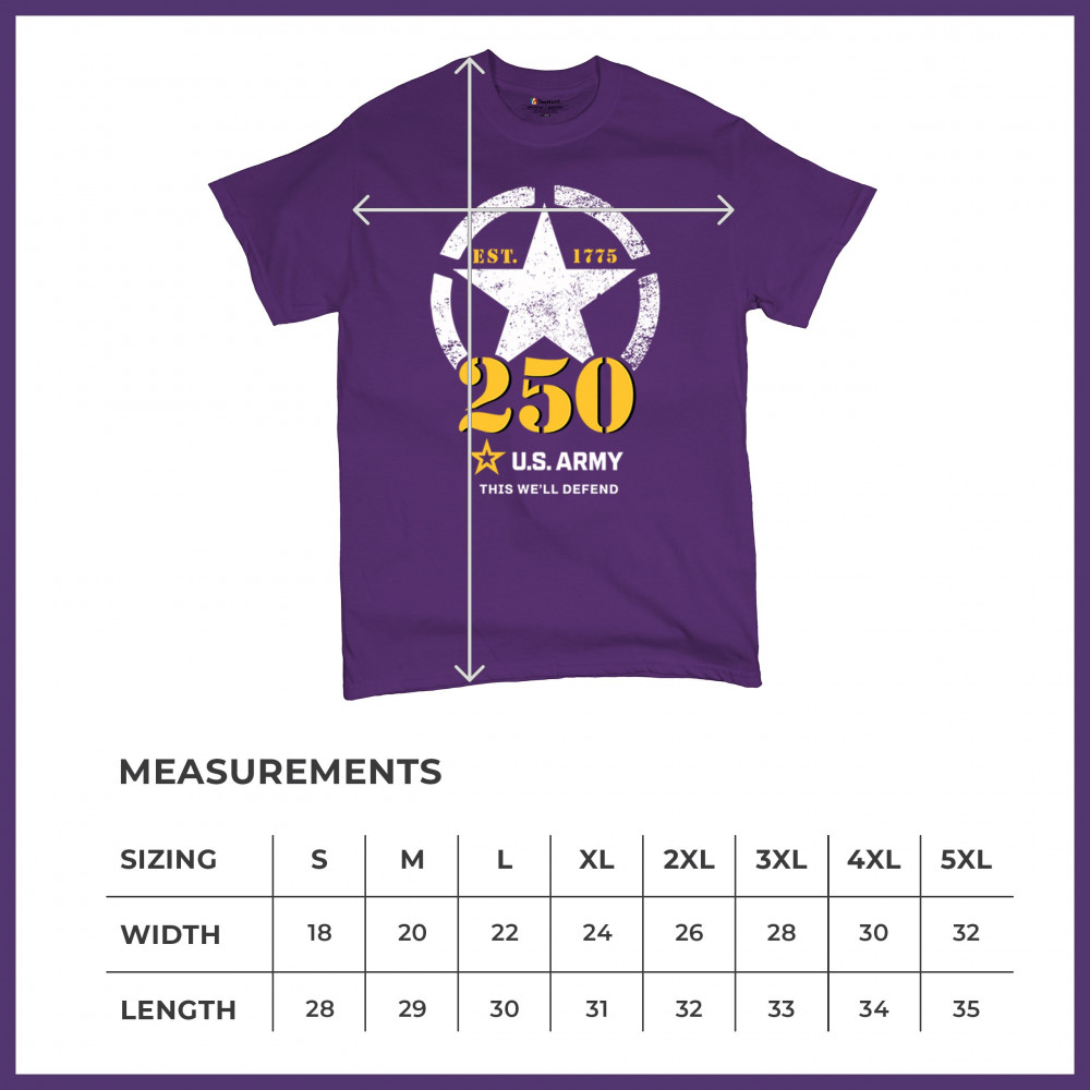Celebrate 250 years of U.S. Army duty and pride with bold stencil design, EST 1775 mark, and patriotic “This We’ll Defend†motto.