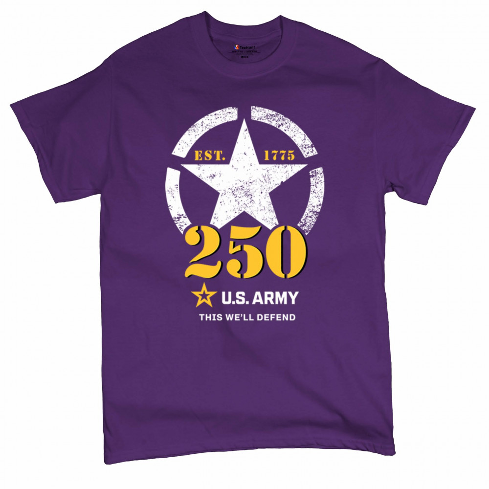 Boldly marking the U.S. Army’s 250th anniversary, this design includes a distressed white star, 1775 EST detail, and bold yellow “250†typeface beneath the iconic motto “This We’ll Defend.†A fitting tribute for veterans, service members, and families who want to show respect and pride during military observances or patriotic events.