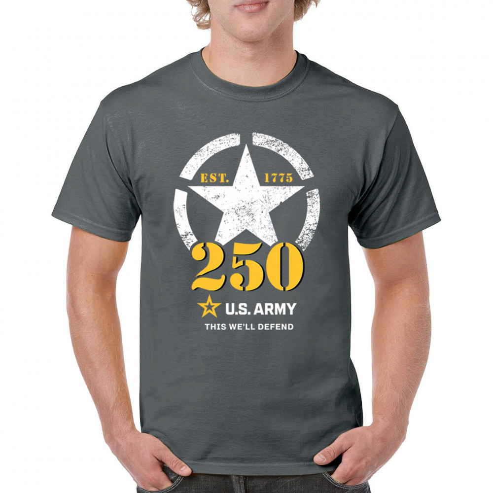 Celebrate 250 years of U.S. Army duty and pride with bold stencil design, EST 1775 mark, and patriotic “This We’ll Defend†motto.