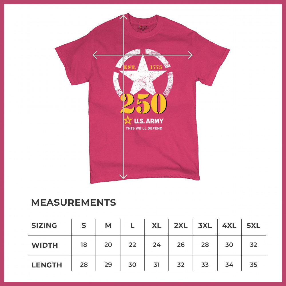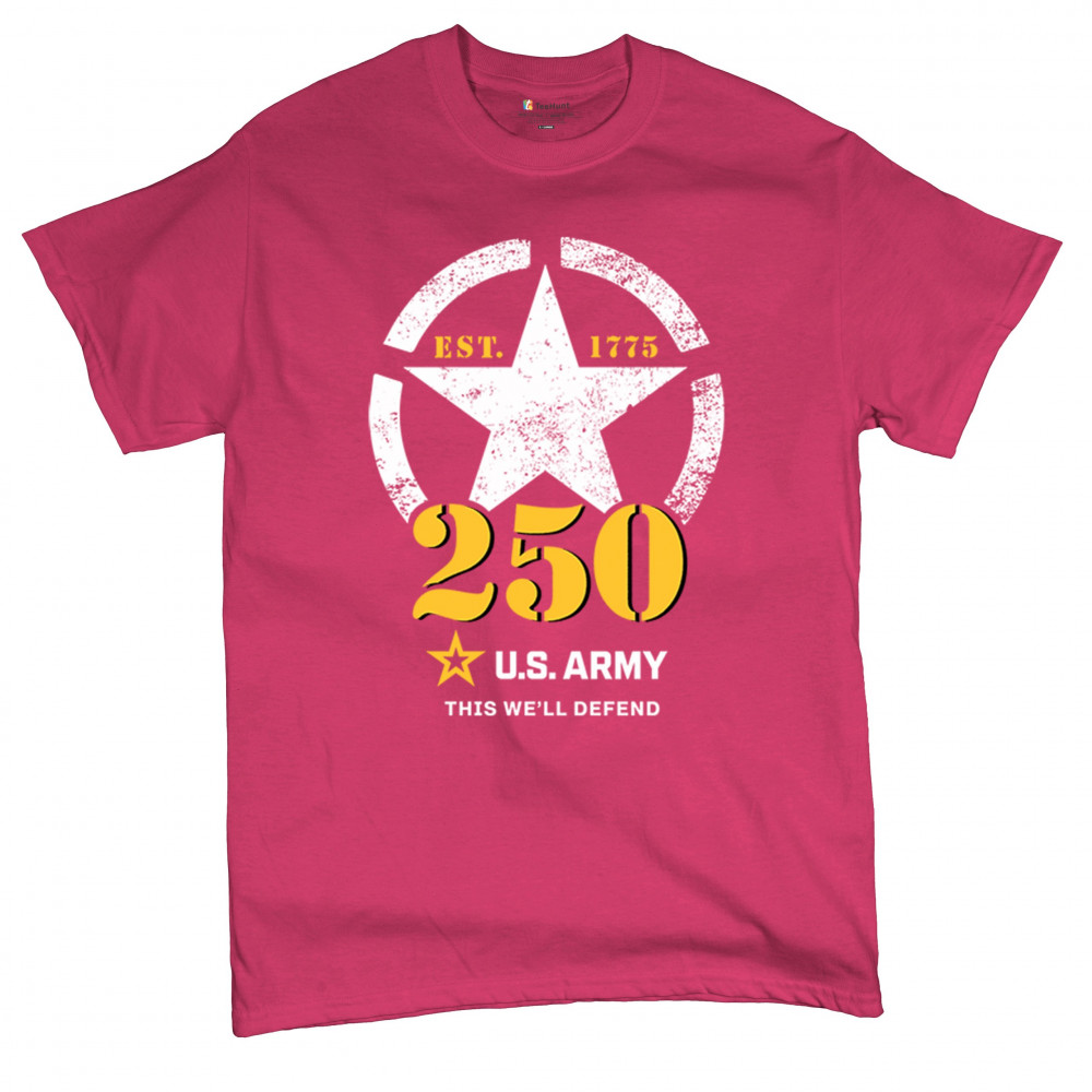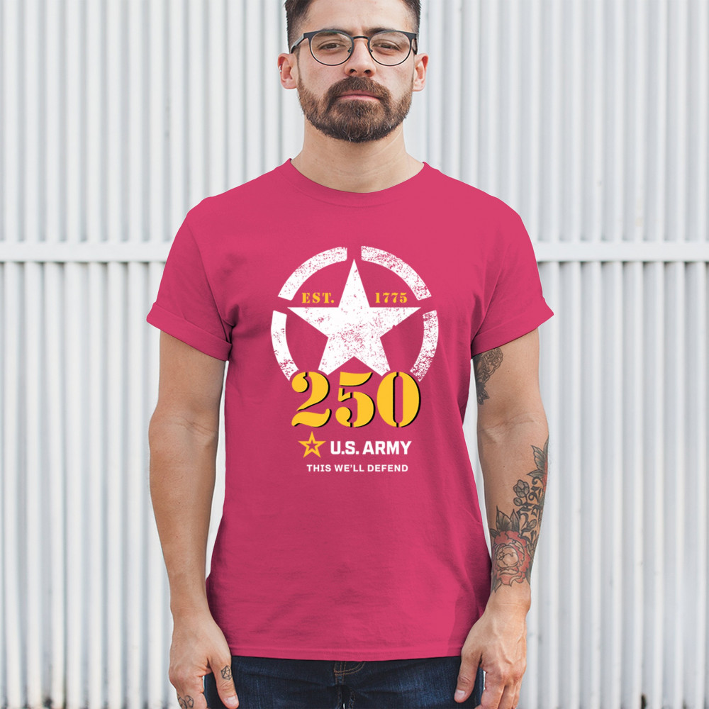 Boldly marking the U.S. Army’s 250th anniversary, this design includes a distressed white star, 1775 EST detail, and bold yellow “250†typeface beneath the iconic motto “This We’ll Defend.†A fitting tribute for veterans, service members, and families who want to show respect and pride during military observances or patriotic events.