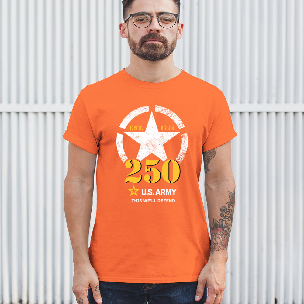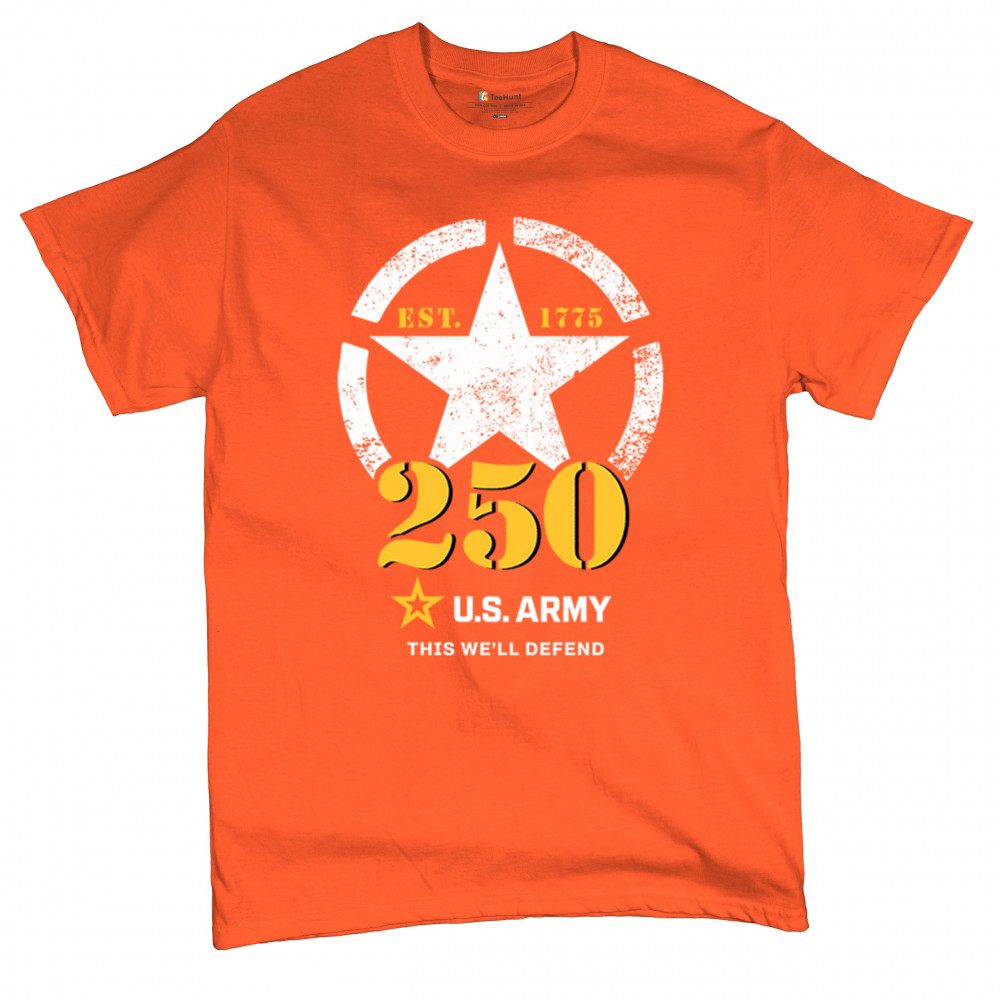 Boldly marking the U.S. Army’s 250th anniversary, this design includes a distressed white star, 1775 EST detail, and bold yellow “250†typeface beneath the iconic motto “This We’ll Defend.†A fitting tribute for veterans, service members, and families who want to show respect and pride during military observances or patriotic events.