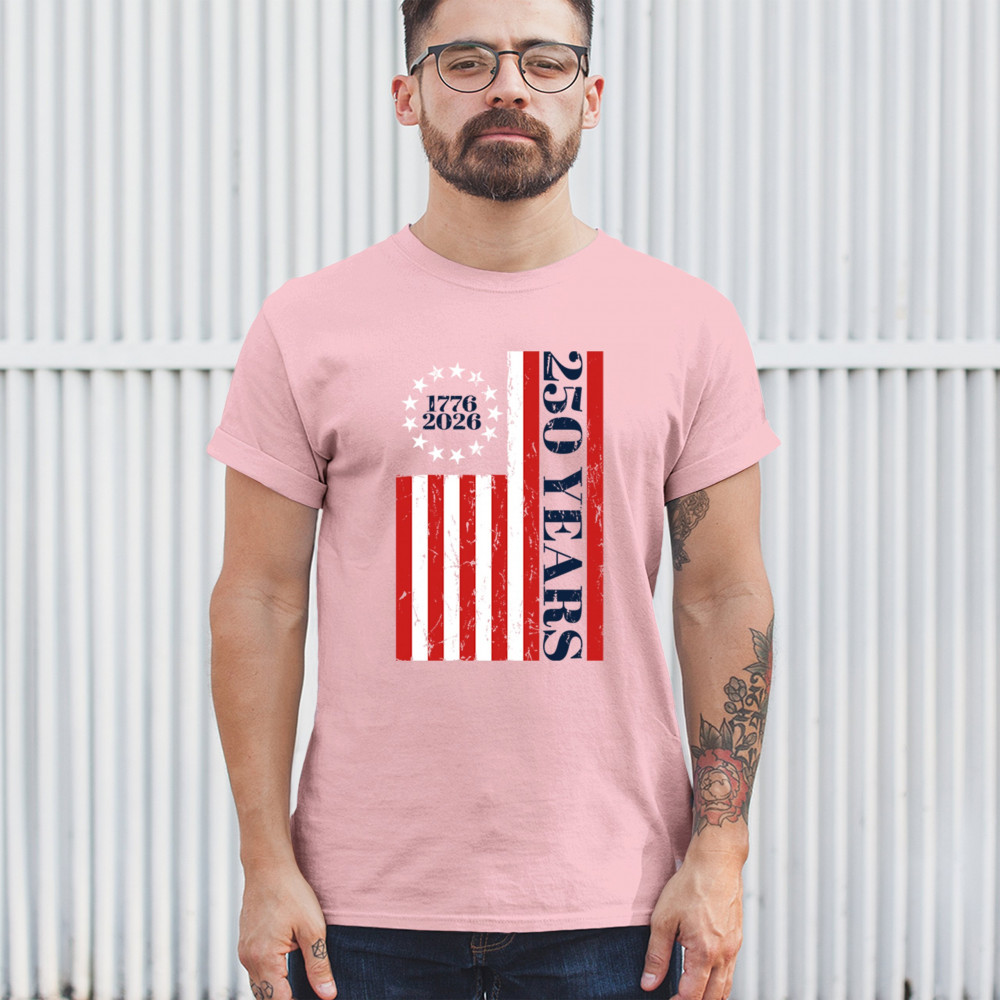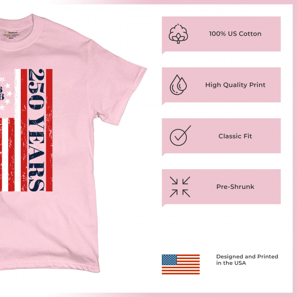 Celebrate USA 250 with patriotic flag shirt, America heritage 250, 1776–2026 milestone, American pride, and Independence Day freedom.
