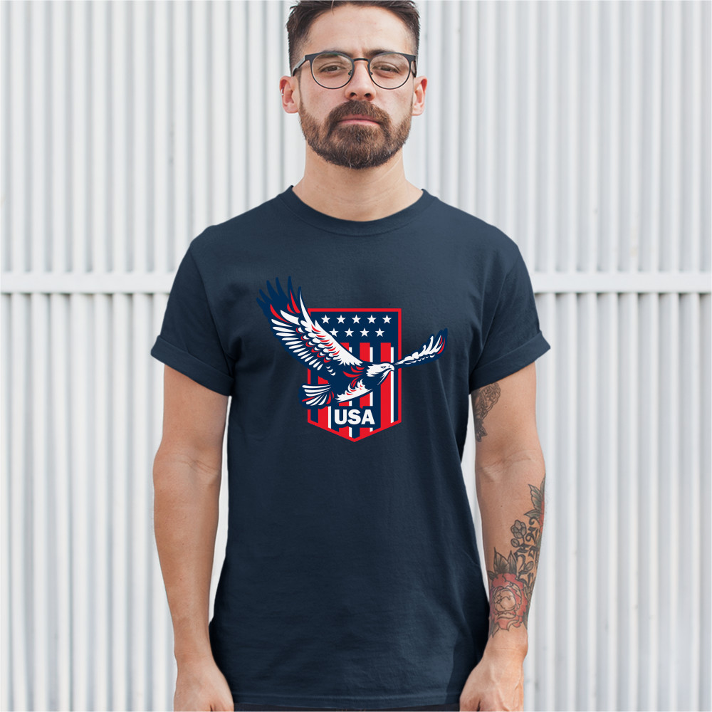 USA BALD EAGLE t-shirt stars and stripes shield 4th of july men's tee navy blue