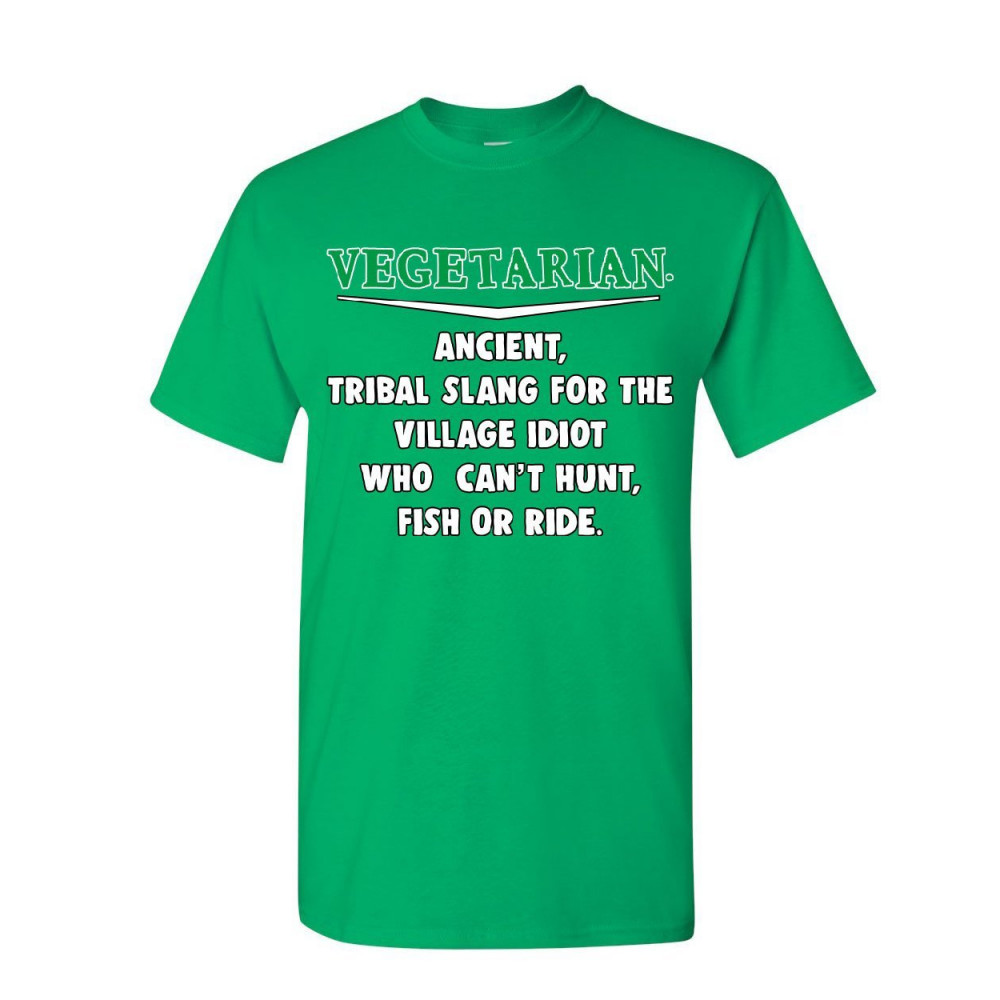 VEGETARIAN - VILLAGE IDIOT vegetarian definition t-shirt offensive village idiot vegan meat mens tee shirt green