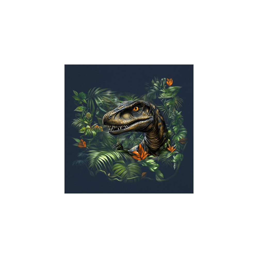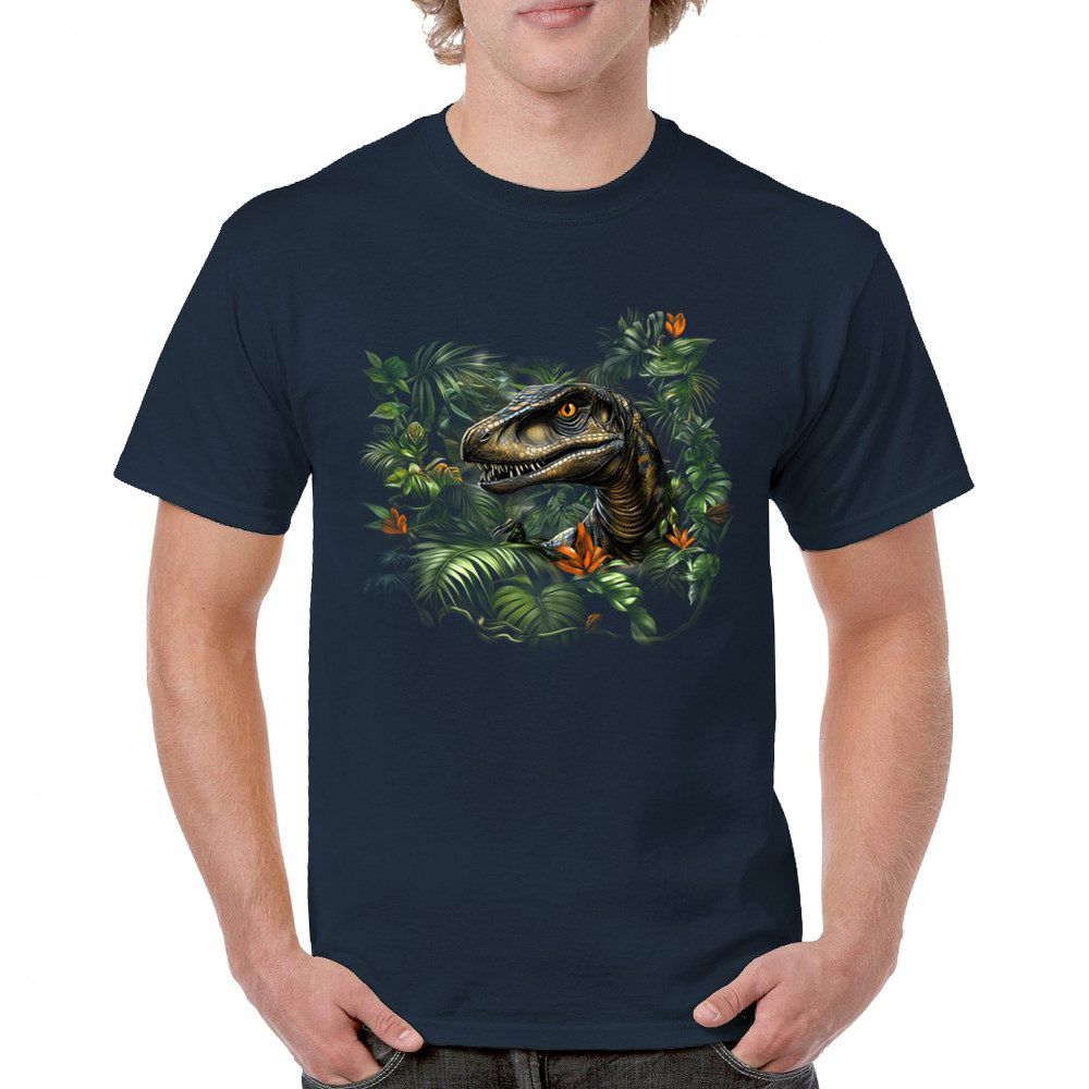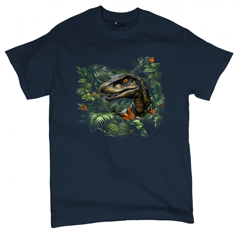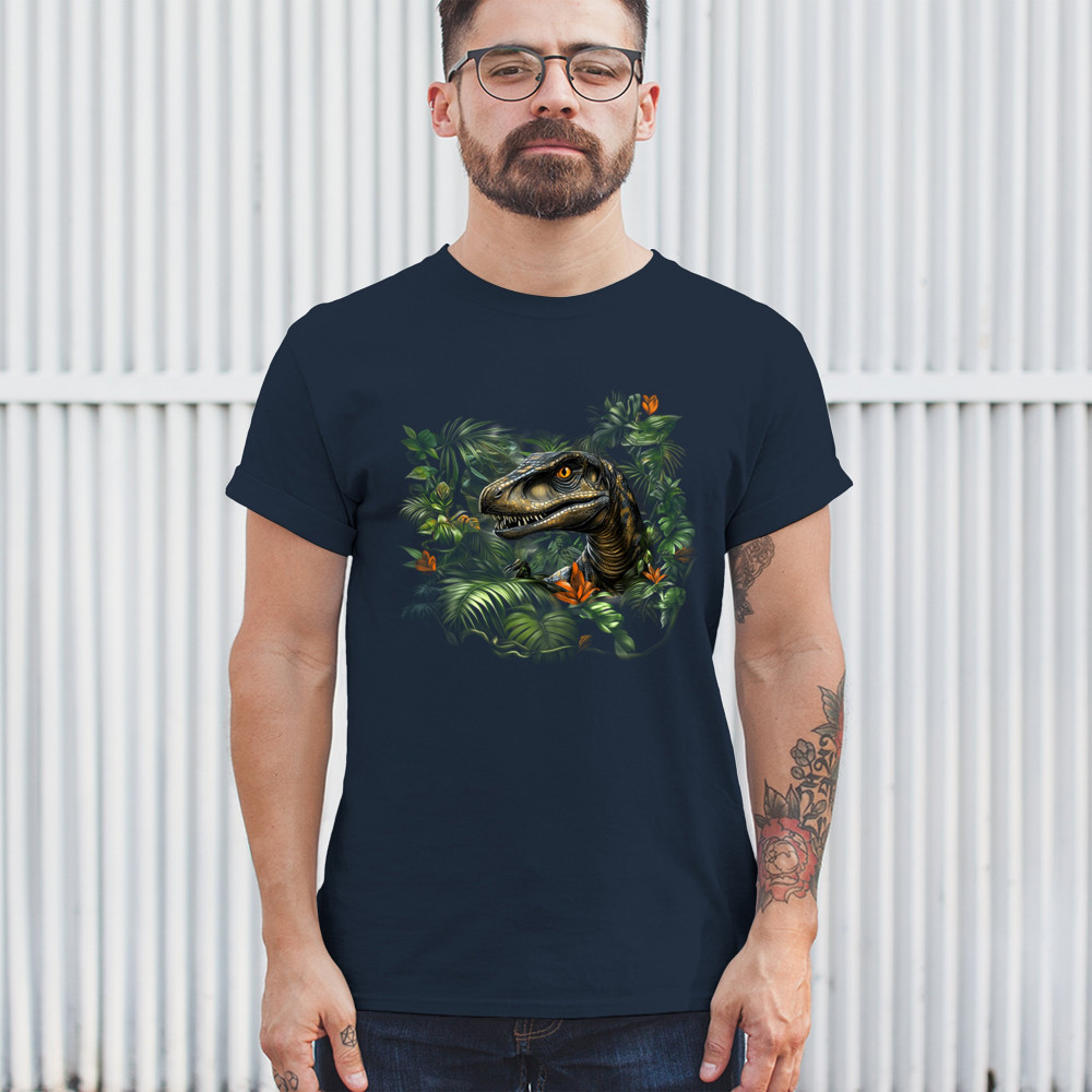 Step into the wild with this striking jungle raptor design. A highly detailed velociraptor peeks from vivid tropical foliage and flowers, perfect for dinosaur lovers, fossil fans, and ancient creature enthusiasts. Whether for Jurassic adventures, museum trips, or themed events, this design unleashes untamed prehistoric energy.