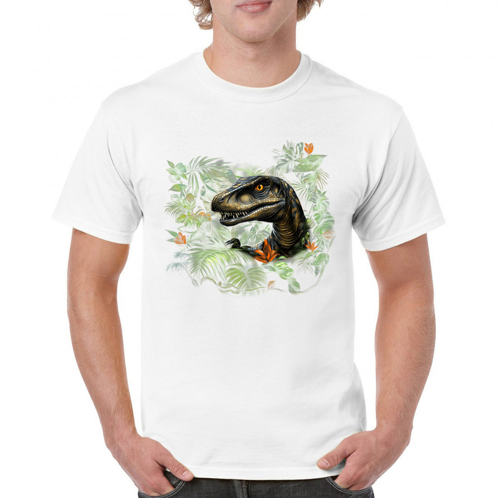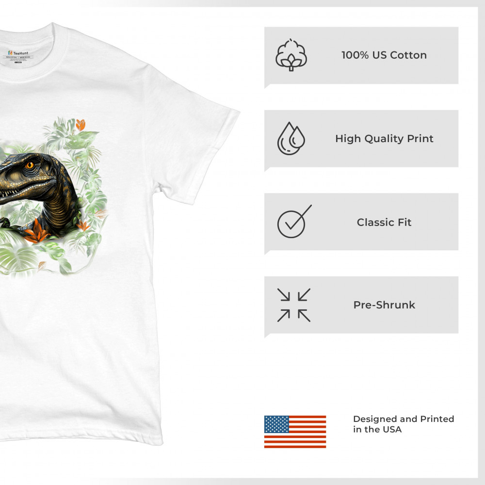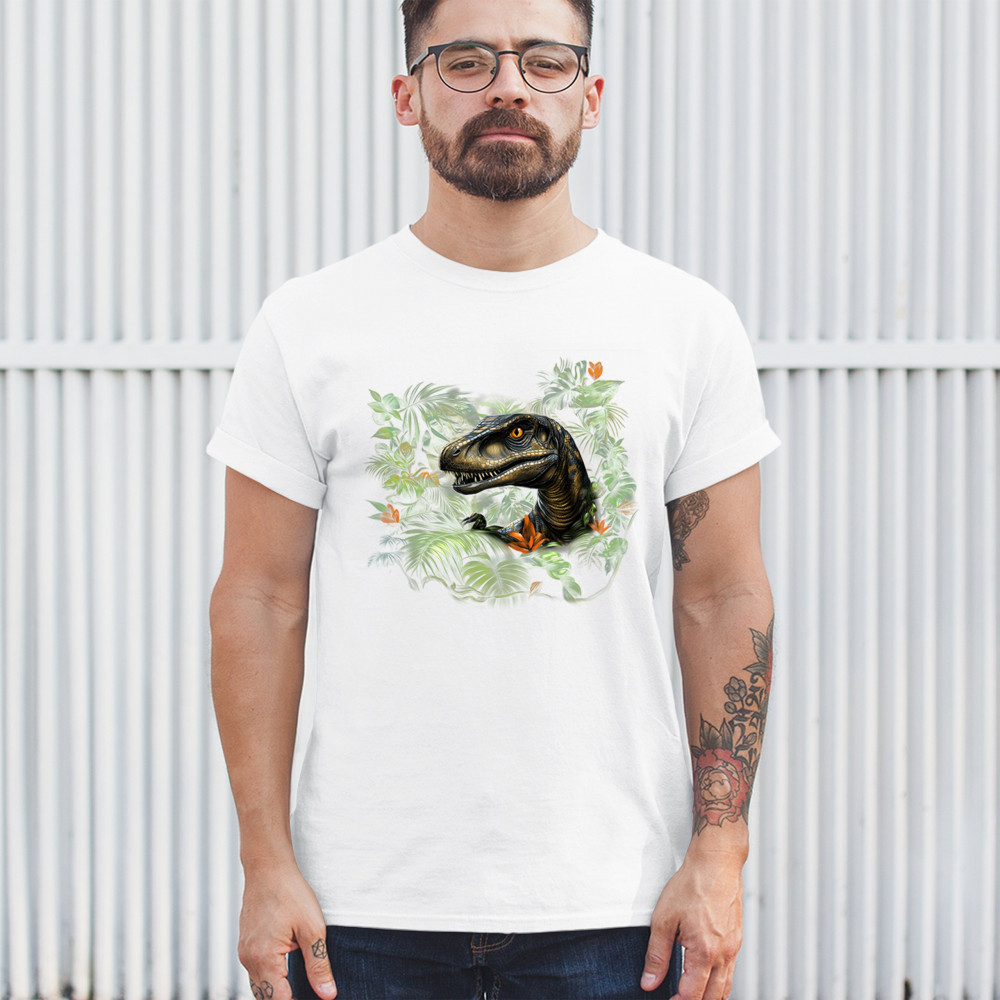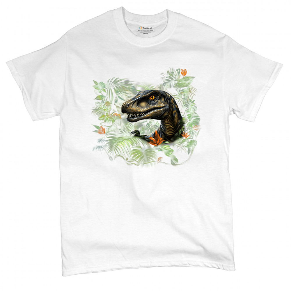 Step into the wild with this striking jungle raptor design. A highly detailed velociraptor peeks from vivid tropical foliage and flowers, perfect for dinosaur lovers, fossil fans, and ancient creature enthusiasts. Whether for Jurassic adventures, museum trips, or themed events, this design unleashes untamed prehistoric energy.