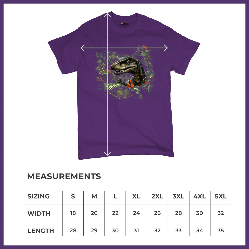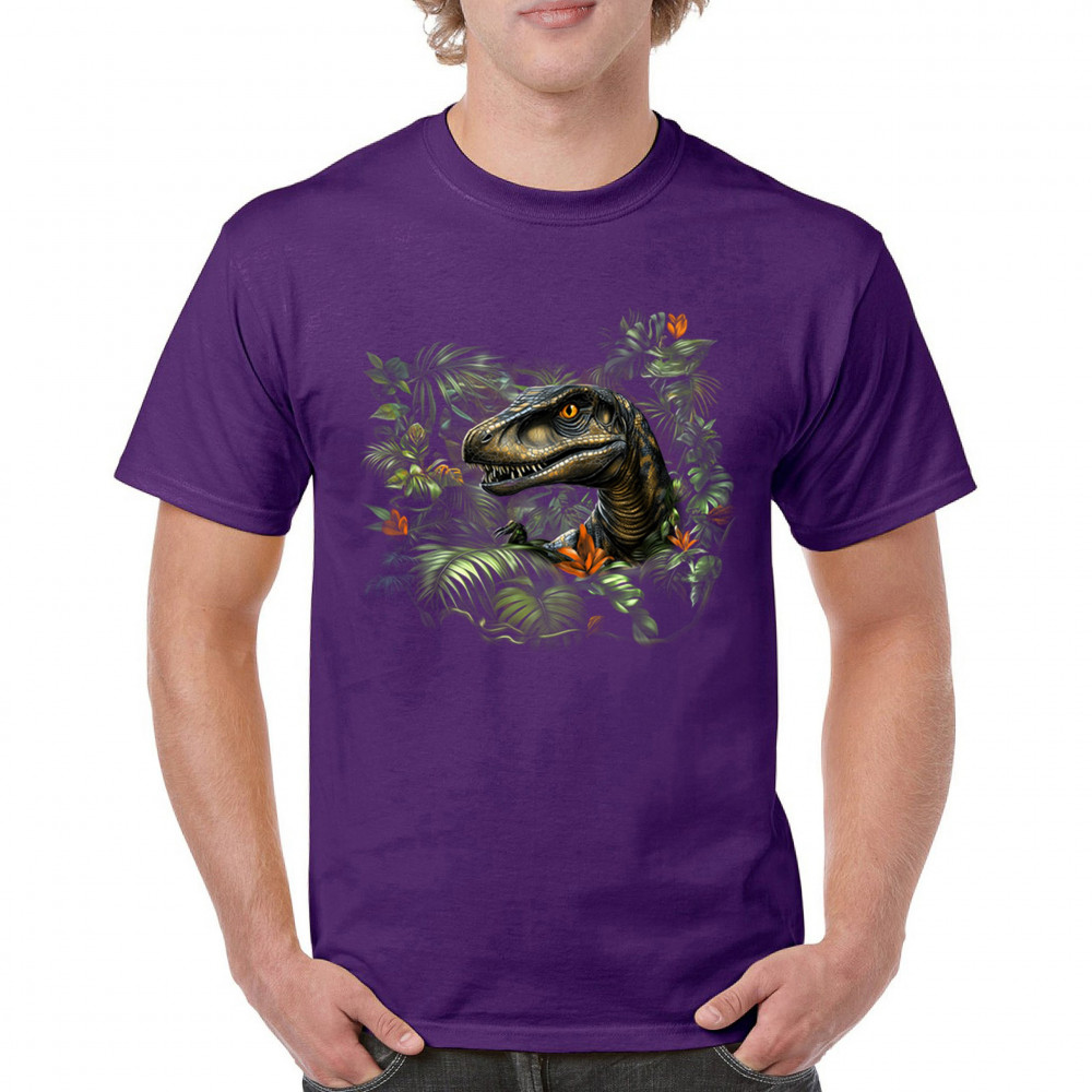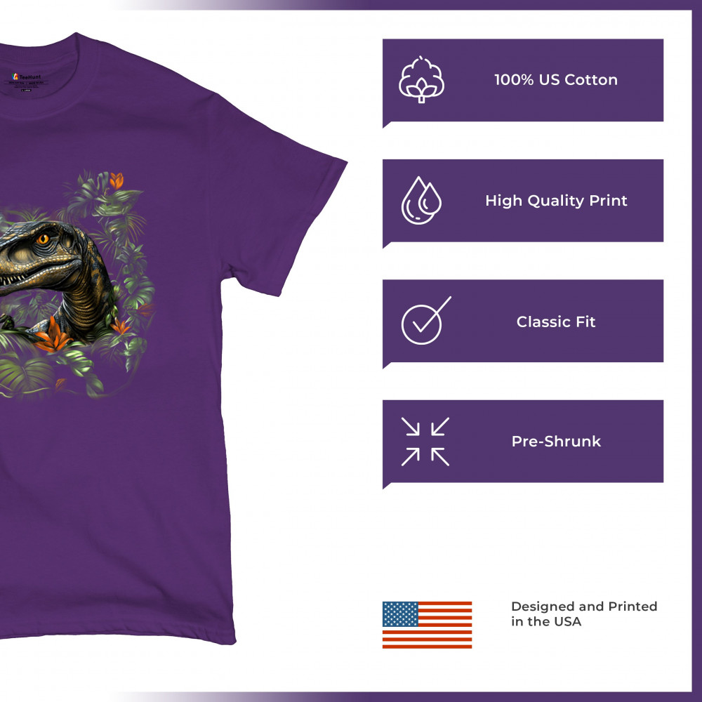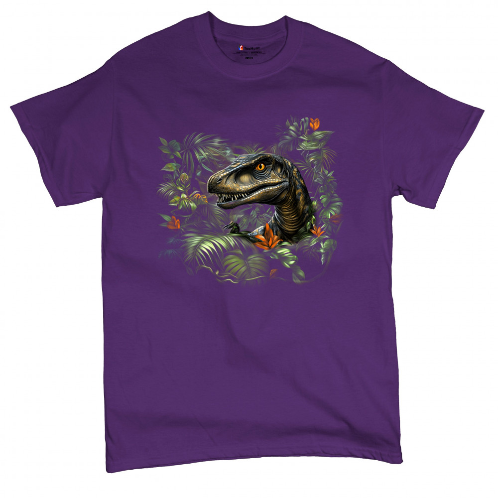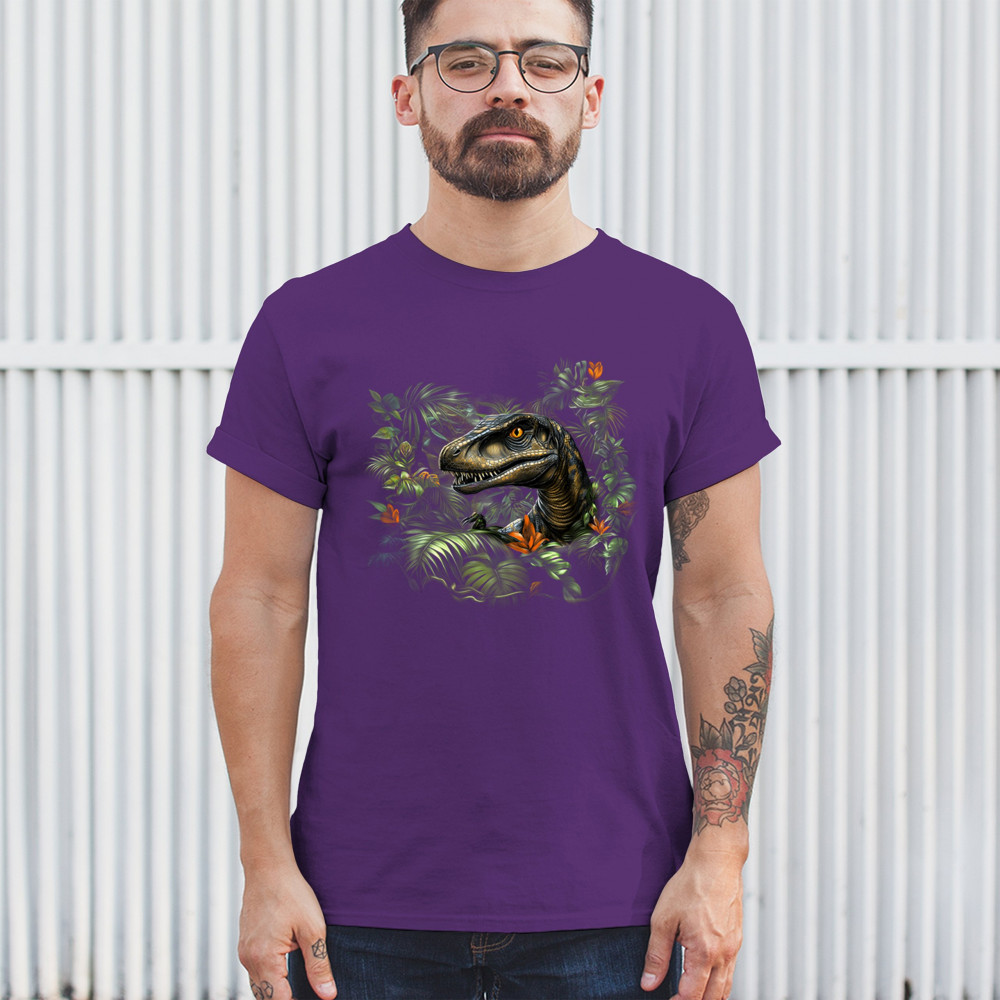 Step into the wild with this striking jungle raptor design. A highly detailed velociraptor peeks from vivid tropical foliage and flowers, perfect for dinosaur lovers, fossil fans, and ancient creature enthusiasts. Whether for Jurassic adventures, museum trips, or themed events, this design unleashes untamed prehistoric energy.