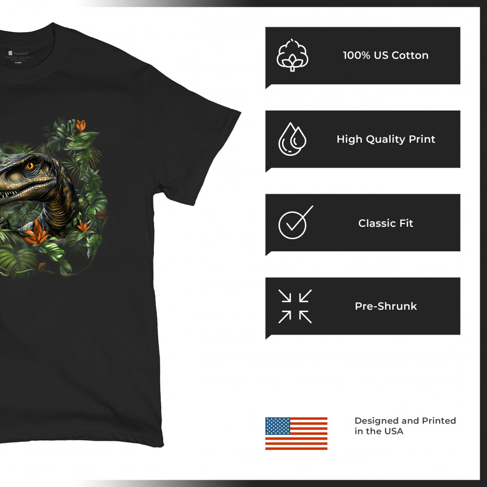 Step into the wild with this striking jungle raptor design. A highly detailed velociraptor peeks from vivid tropical foliage and flowers, perfect for dinosaur lovers, fossil fans, and ancient creature enthusiasts. Whether for Jurassic adventures, museum trips, or themed events, this design unleashes untamed prehistoric energy.